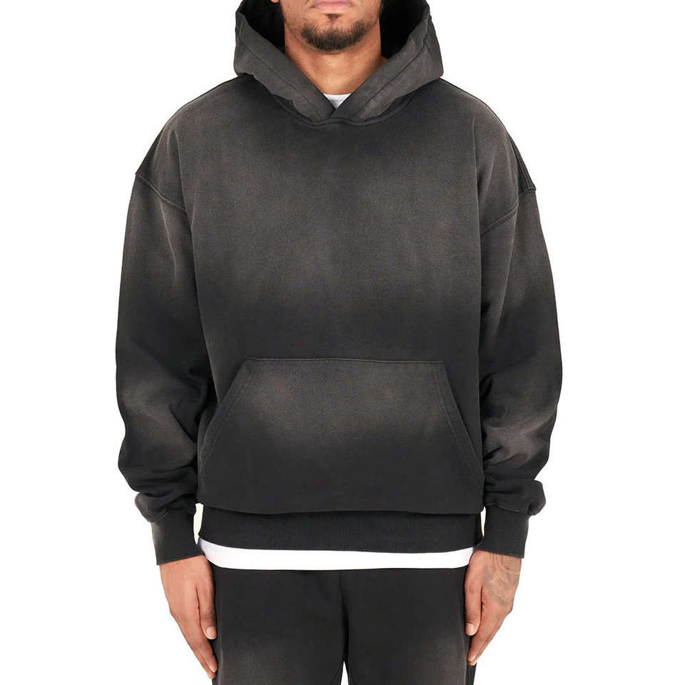 เสื้อฮู้ดดี้วินเทจสองชั้นทรงโอเวอร์ไซส์ ลุคซีดจางแบบย้อมสีด้วยกรด แต่งกระเป๋า ดีไซน์สตรีทแวร์สั่งทำพิเศษ ผ้าฟลีซสำหรับผู้ชาย 100%