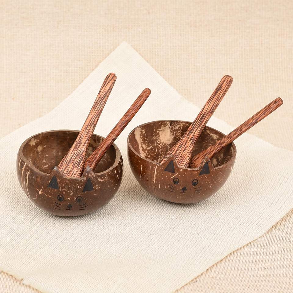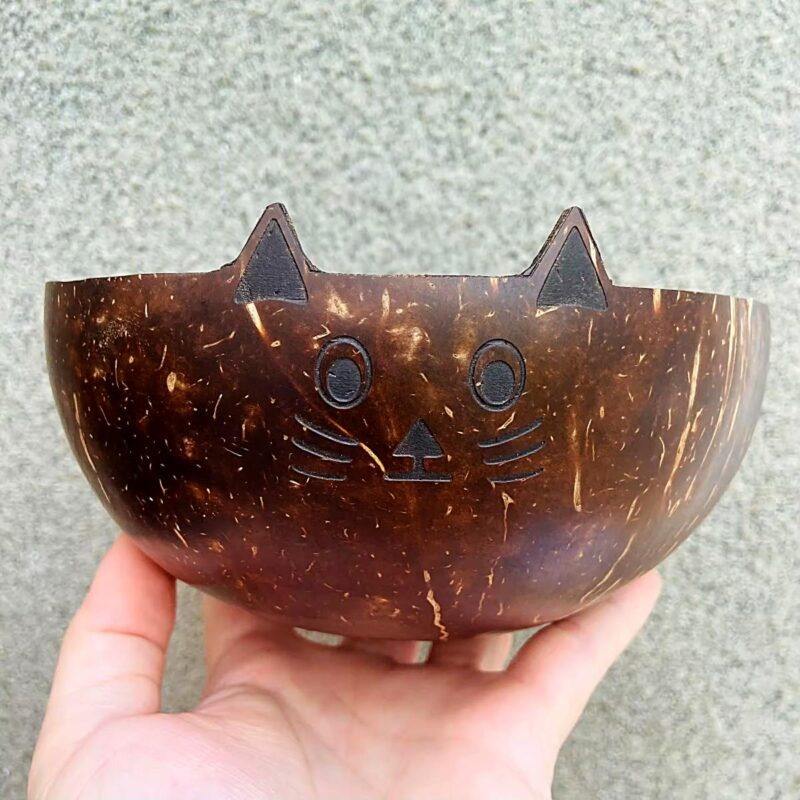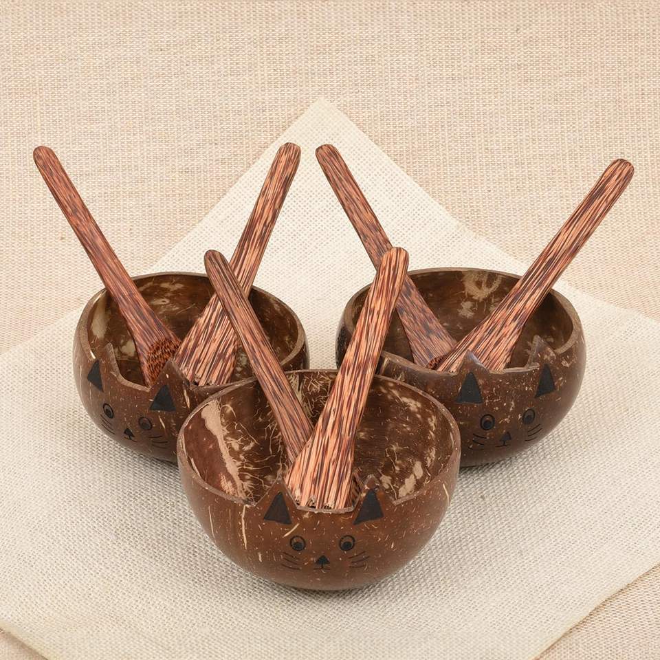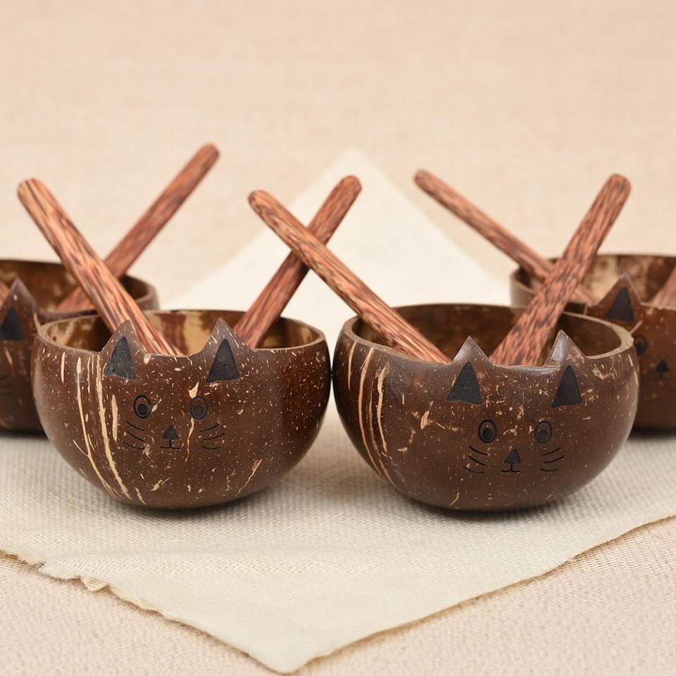 Best price coconut cup bowls cat face natural coco shell bowl biodegradable zerowaste dinnerware set