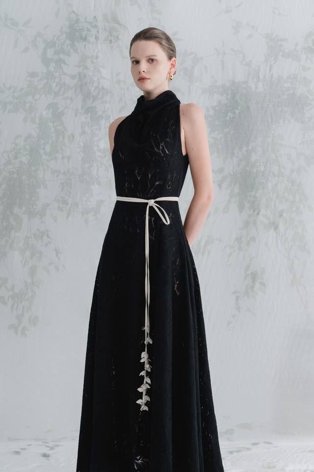 เดรสยาวทรงเอไลน์สีดำและสีเบจสำหรับผู้หญิงชุดเดรสแม็กซี่แขนกุดลายดอกไม้ผ้าลูกไม้คุณภาพดี