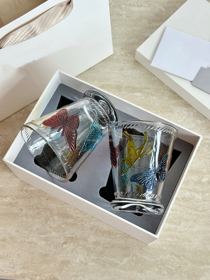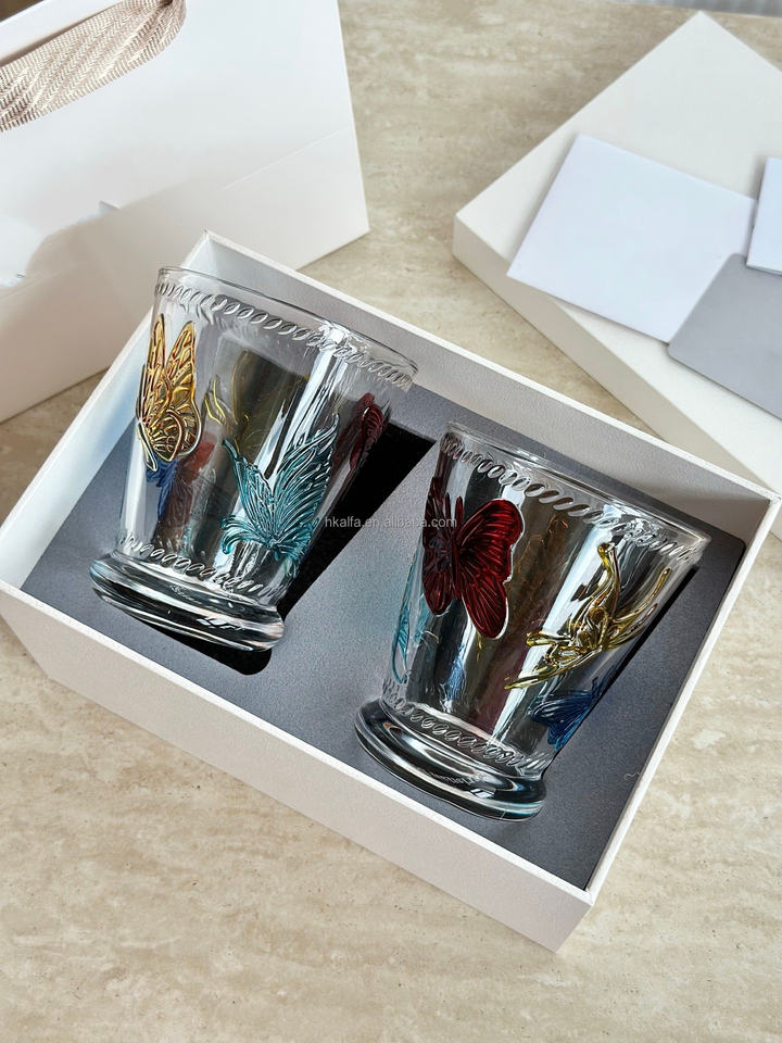 แก้วไวน์/น้ำ ชุดสองใบ ลายผีเสื้อ งานแฮนด์เมด รักษ์โลก พับได้ ลวดลายแกะสลักคริสตัล ขายดี