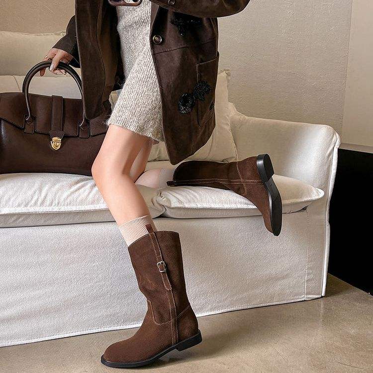 Best-selling Top-grain Cowhide Solid Color Retro Belt-decorated Long Waterproof Anti-slip Durable Casual One-foot Thick-heeled