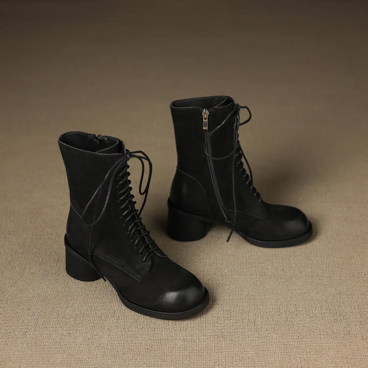 รองเท้าบูทหุ้มข้อกลางน่องหนังวัวแท้คุณภาพดี สีพื้น สไตล์เรโทร ตกแต่งด้วยเข็มขัด กันน้ำ กันลื่น ส้นหนา 1 นิ้ว แบบลำลอง ขายดีที่สุด