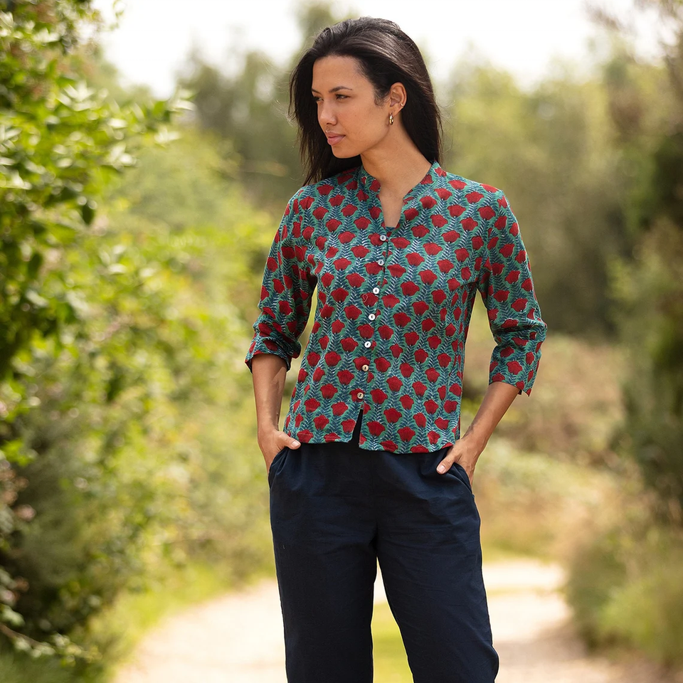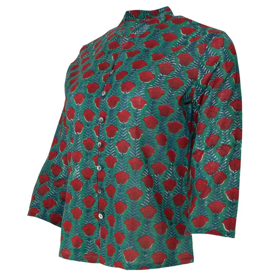 SALE Short KURTA TOP Style 7 Green with Red Tulips Women's Top Indian Top Patterned Top Hand Block For Her