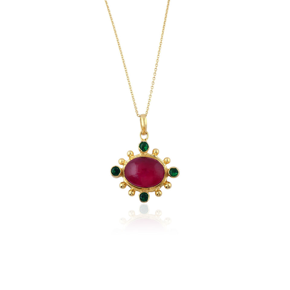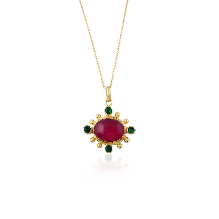 สร้อยคอพลอยขายดีที่สุด จี้รูปทรงพระอาทิตย์ประดับทับทิมและหยก พร้อมมรกตควอตซ์ ชุบทอง 18k บนทองเหลือง