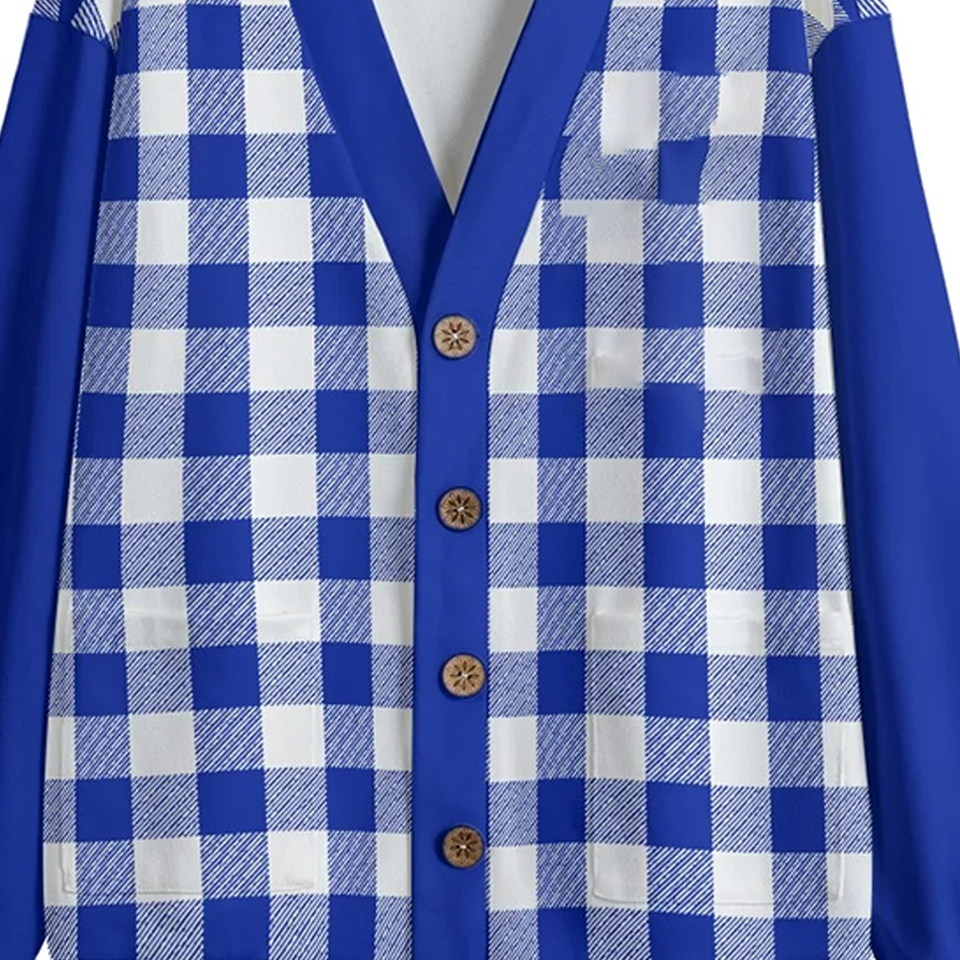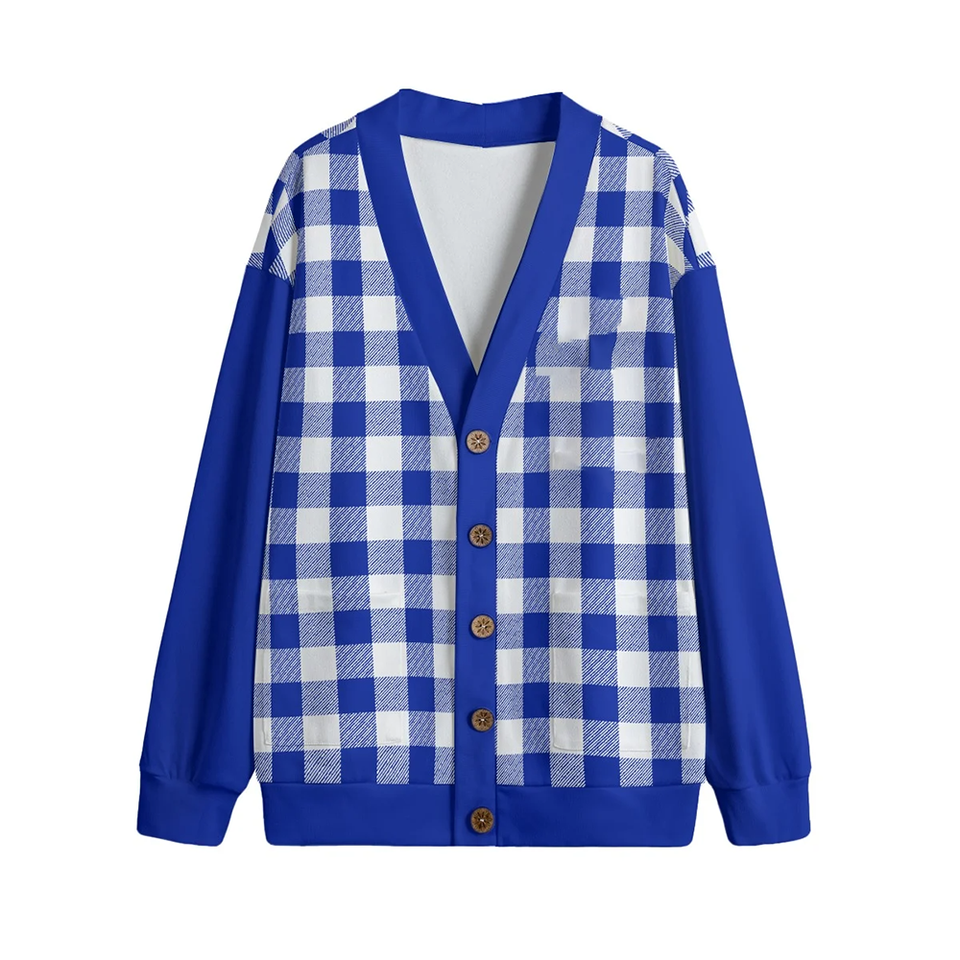 เสื้อคาร์ดิแกนไหมพรมถักสีน้ำเงินและสีขาว Beta Phi Sigma คอวี ปิดด้วยกระดุม ทรงหลวม แขนยาว ผ้าเรียบ สำหรับฤดูหนาว