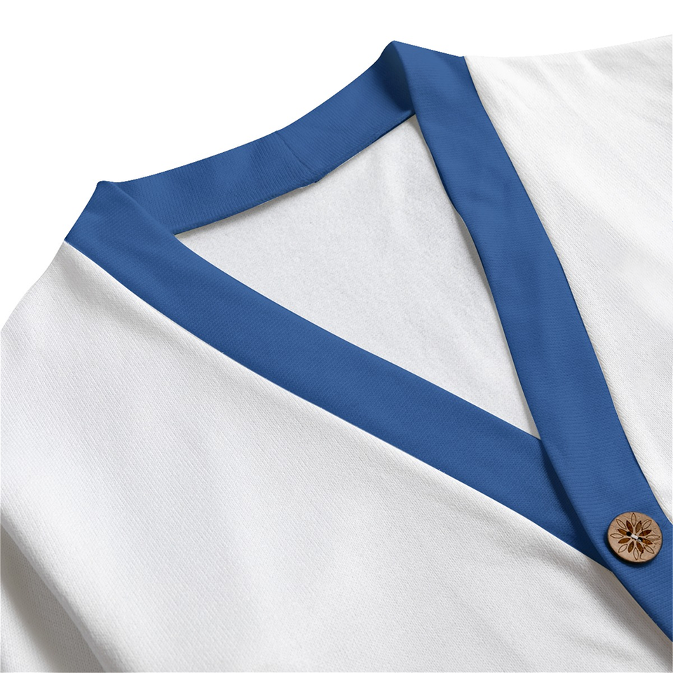 เสื้อคาร์ดิแกนไหมพรมคอวีลายอาร์ไกล์ แบรนด์เบต้าฟิซิกม่า สำหรับทุกเพศ ผ้าวูล/แคชเมียร์ สีน้ำเงินและขาว ลวดลายสบายๆ สำหรับฤดูใบไม้ร่วงและฤดูหนาว
