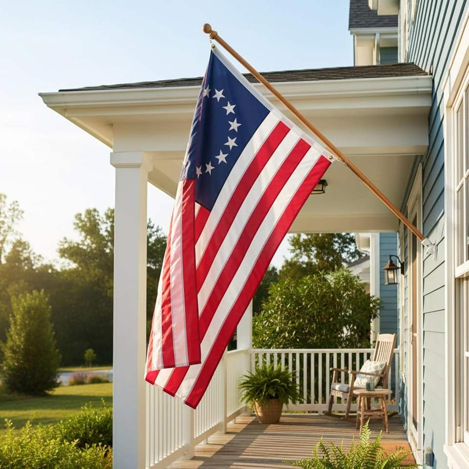 ธงชาติอเมริกันปักลาย 13 ดาว ขนาด 2x3 ฟุต ยี่ห้อ Betsy Ross ผ้าโพลีเอสเตอร์คุณภาพสูง ทนทาน กันน้ำ เป็นมิตรกับสิ่งแวดล้อม เหมาะสำหรับใช้งานกลางแจ้ง ฉลองครบรอบ 250 ปี