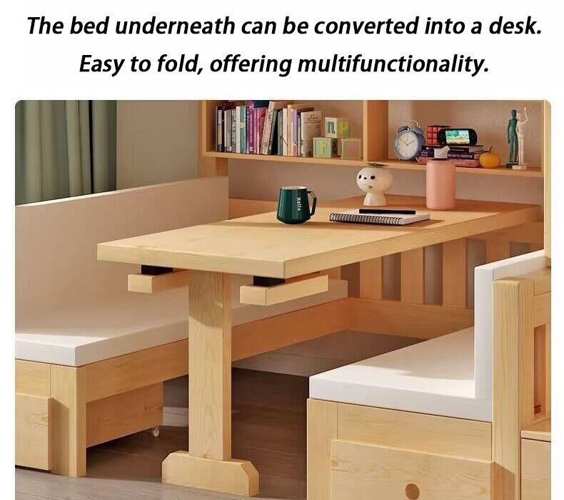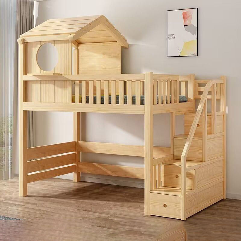 กรอบไม้สองชั้นแบบคู่บนเตียงสองชั้นพร้อมหลังคาและบันไดสำหรับเด็กห้องนอนหรือห้องนั่งเล่นสภาพแวดล้อมในการนอนหลับที่ดีขึ้น