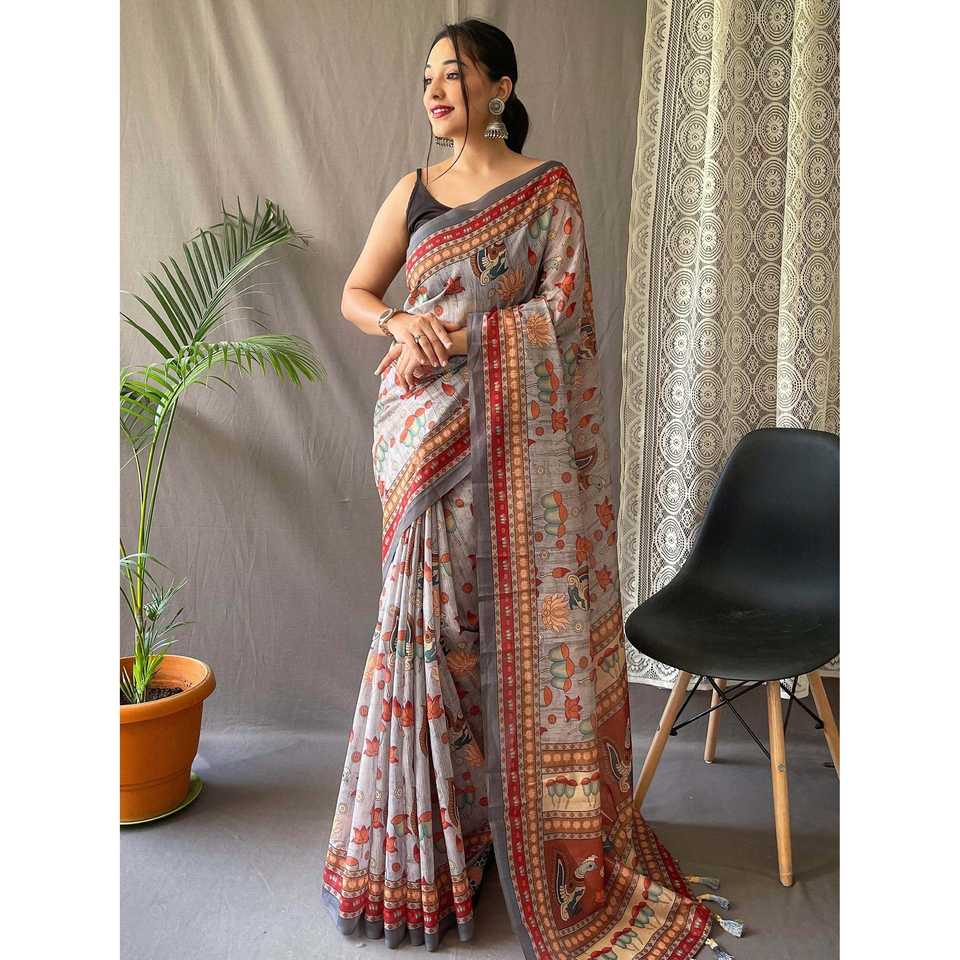 ผ้าส่าหรีผ้าฝ้ายพิมพ์ลายคาลัมคารีสีเทาอ่อนสวยงาม ชุดแบบดั้งเดิมของจีน