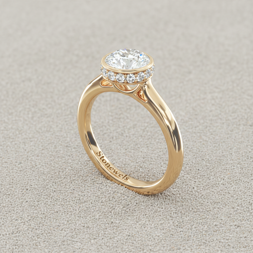 แหวนหมั้นแบบเบเซลโซลิแทร์ประดับมงกุฎแบบปาเว่ ทำจากทองคำแท้ | เพชรทรงกลมจาก Round Lab