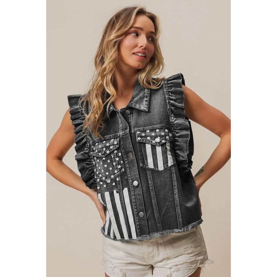 แจ็คเก็ตยีนส์ฟอกลายธงชาติอเมริกัน Bibi เสื้อกั๊ก & เสื้อกั๊กสไตล์วินเทจ