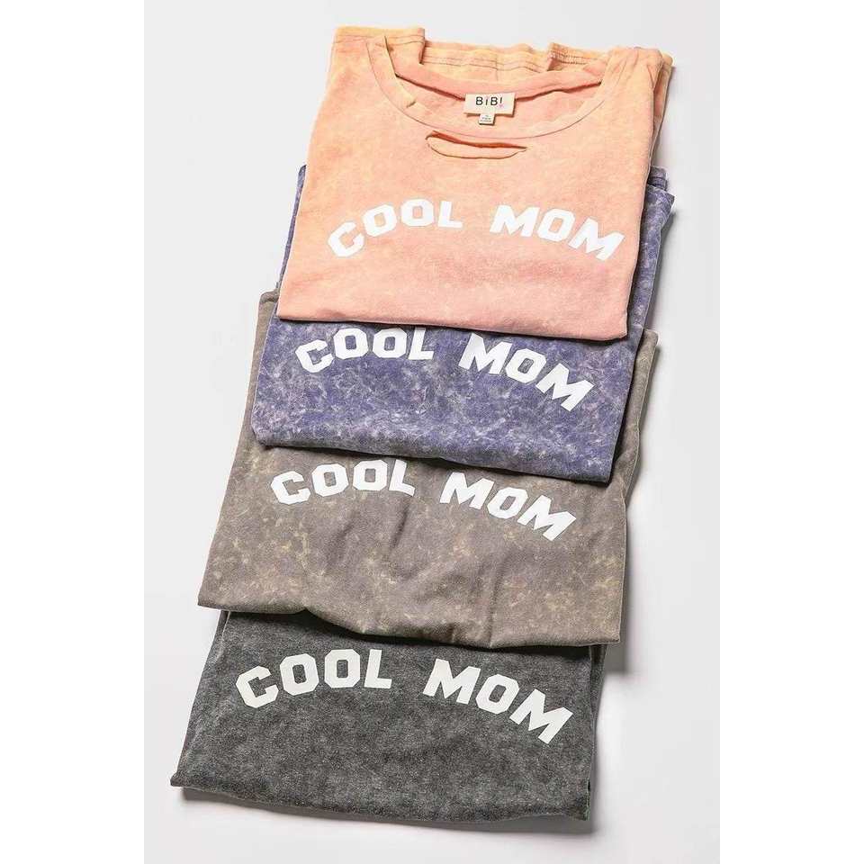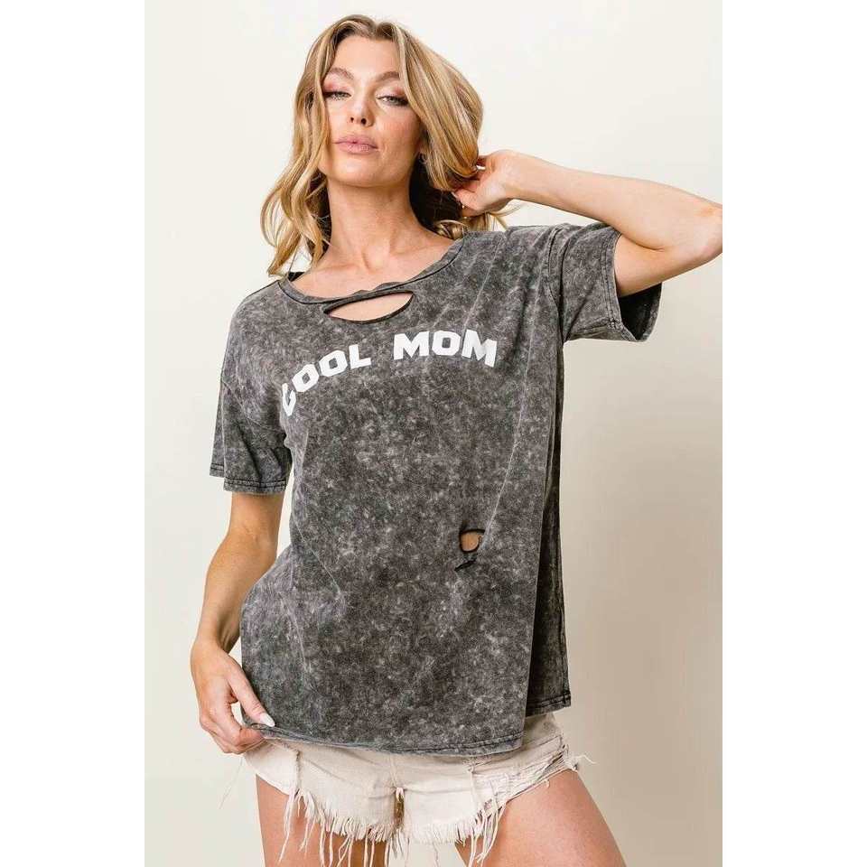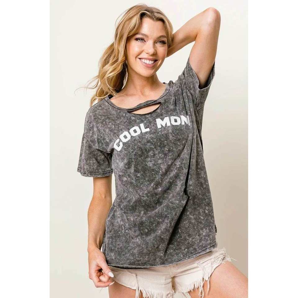 BiBi Women's BLACK CHARCOAL Cool Mom Print Top S with Washed Laser Cut Detail