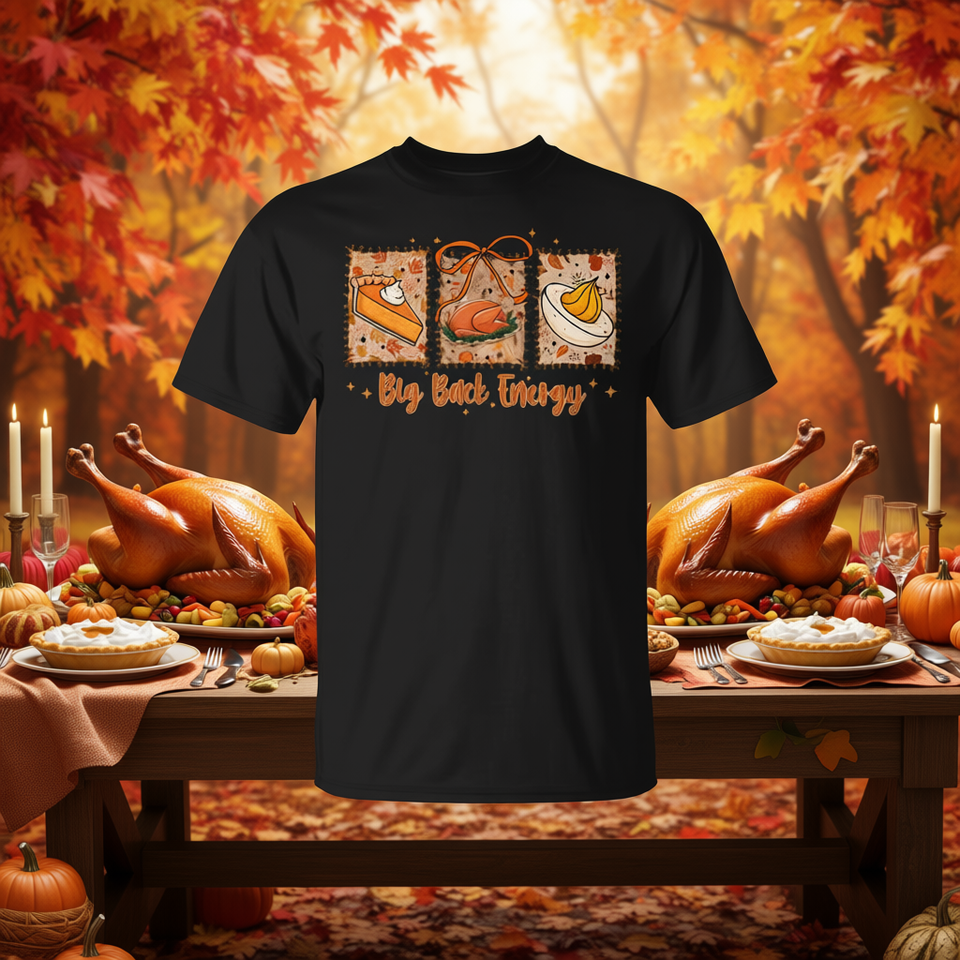 เสื้อยืดวันขอบคุณพระเจ้า Big Back Energy ลายพายไก่งวง สีดำ คอกลม แขนสั้น สำหรับทุกเพศ