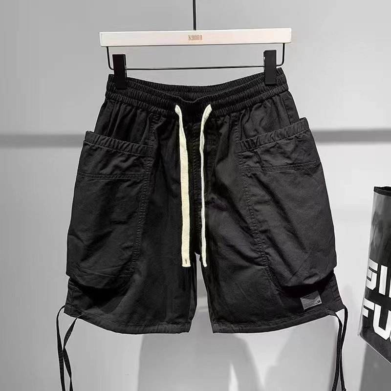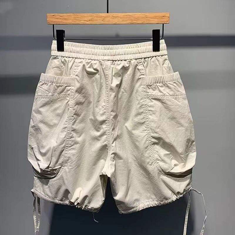 กางเกงขาสั้นคาร์โก้แบบมีเชือกรูดมีกระเป๋าขนาดใหญ่สำหรับผู้ชายกางเกงขากว้างทรงหลวมลำลองสีพื้นใส่ในฤดูร้อน