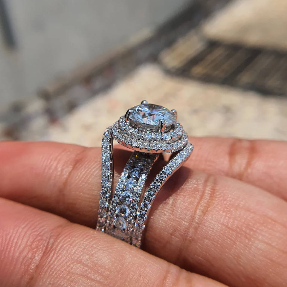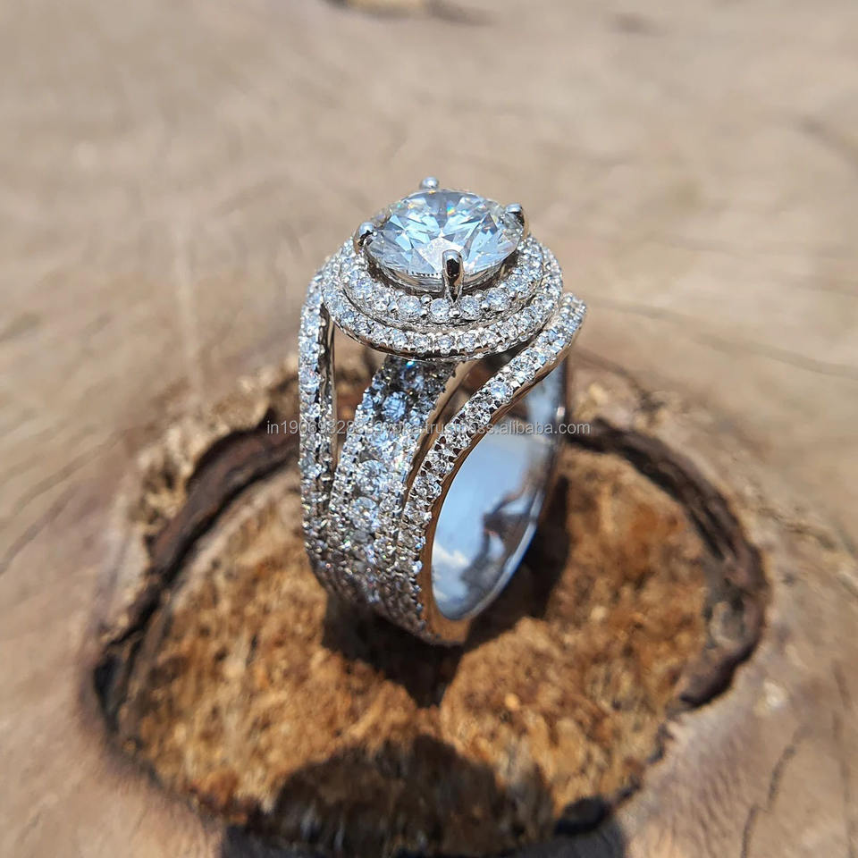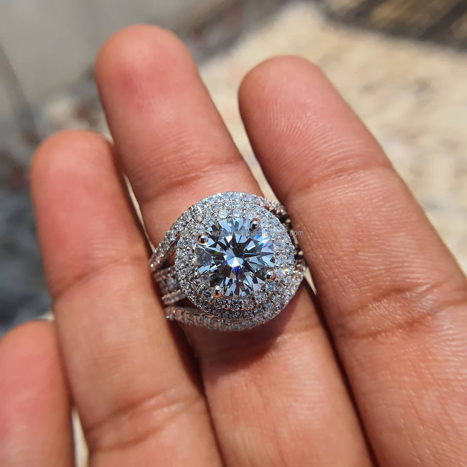 แหวนหมั้นและแต่งงานทรงคลัสเตอร์ฮิปฮอปประดับเพชรโมอิสซาไนต์เม็ดใหญ่ ตัวเรือนชุบแพลตตินัม ดีไซน์วงแหวนสองชั้น สำหรับผู้หญิง สไตล์คนดัง
