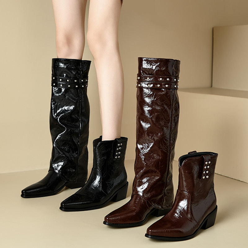 รองเท้าส้นเหลี่ยมทรงกว้างไซส์ใหญ่ 48 หัวแหลม แบบสวมใส่ได้ 2 แบบ พร้อมหัวเข็มขัด รองเท้าบูทสูงถึงเข่าสำหรับผู้หญิง