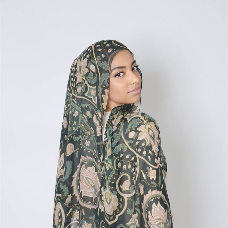 ฮิญาบผ้าซาตินมุสลิมผ้าโพลีเอสเตอร์อาหรับพิมพ์ลายแบบดั้งเดิมฮิญาบประดับเลื่อมย่น