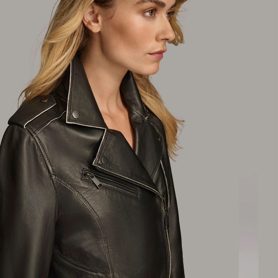 เสื้อแจ็คเก็ตหนังแกะแท้สไตล์ไบค์เกอร์สำหรับผู้หญิง พร้อมซิปคู่ ระบายอากาศได้ดี และตกแต่งแบบเสื้อวาร์ซิตี้