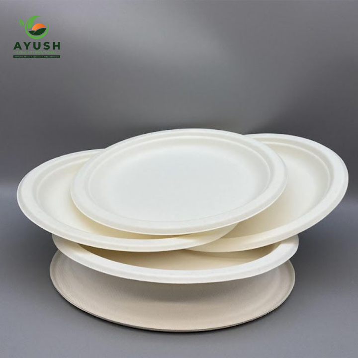 จานใช้แล้วทิ้งแบบย่อยสลายได้ทางชีวภาพ ผลิตจากเยื่อชานอ้อย สำหรับงานเลี้ยงบุฟเฟ่ต์ ร้านอาหาร และอาหารแบบนำกลับบ้าน