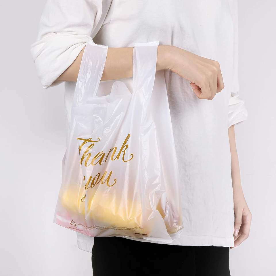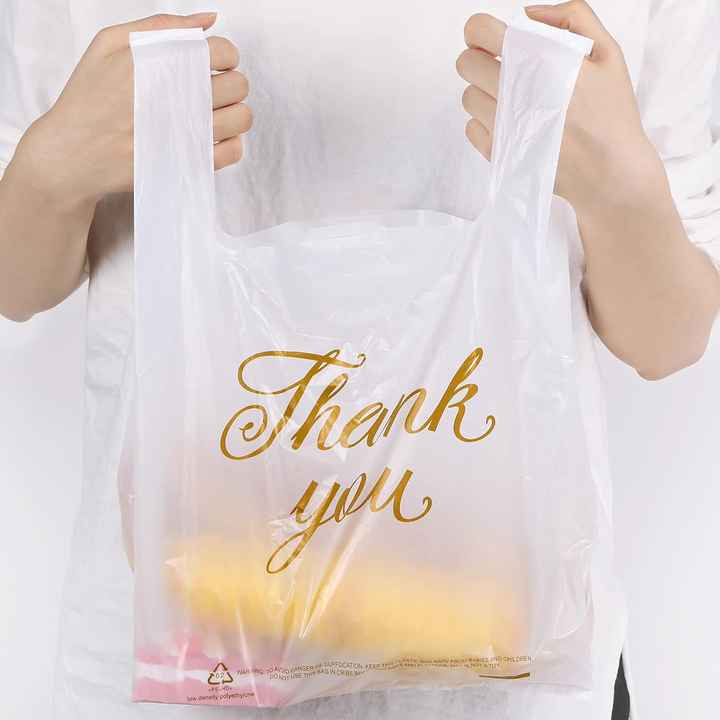 ถุงเสื้อยืดพิมพ์โลโก้แบบกำหนดเอง ย่อยสลายได้ พร้อมหูหิ้ว สำหรับร้านค้าปลีกขนาดเล็ก-วัสดุ PE ตัวเลือกการพิมพ์ซิลค์สกรีน/แพดพิมพ์