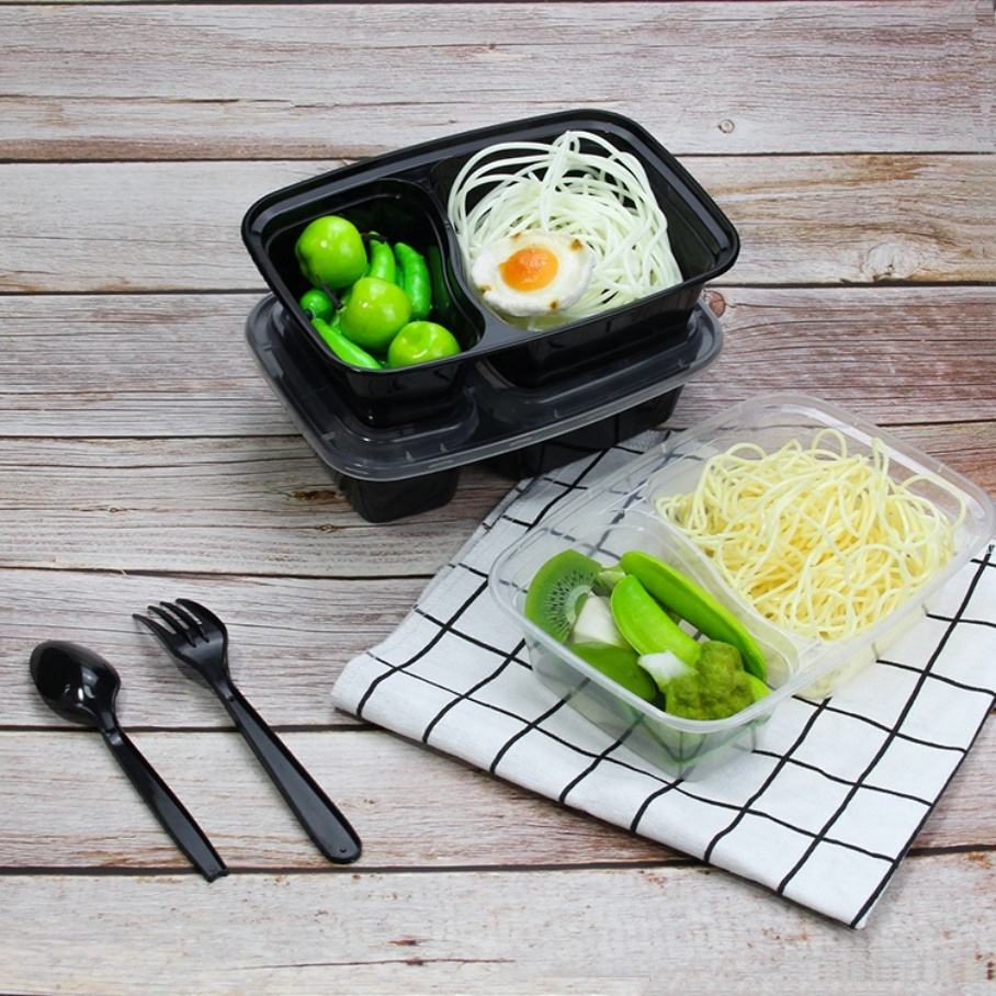 กล่องใส่อาหารแบบใช้แล้วทิ้ง 2 ช่อง สีดำ ผลิตจากพลาสติก PP เกรดอาหาร ย่อยสลายได้ เป็นมิตรกับสิ่งแวดล้อม ป้องกันการรั่วซึม เหมาะสำหรับใส่ก๋วยเตี๋ยว