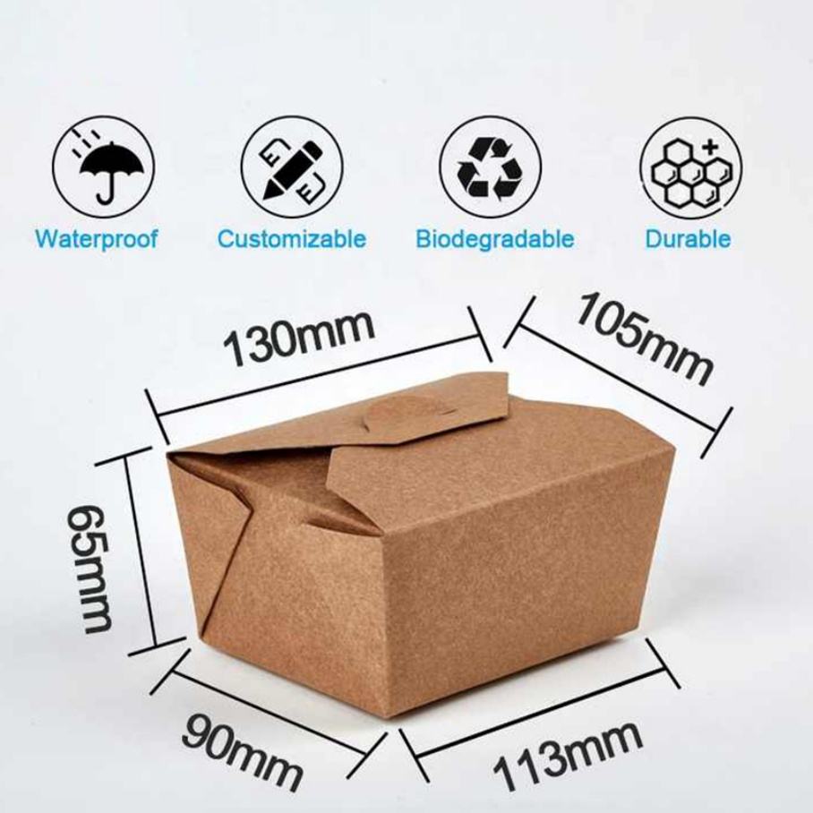 กล่องอาหารกลางวันกระดาษคราฟท์แบบใช้แล้วทิ้ง ย่อยสลายได้ ป้องกันการรั่วซึม พร้อมลายนูนและเคลือบยูวี สำหรับใส่ขนมและพิซซ่า