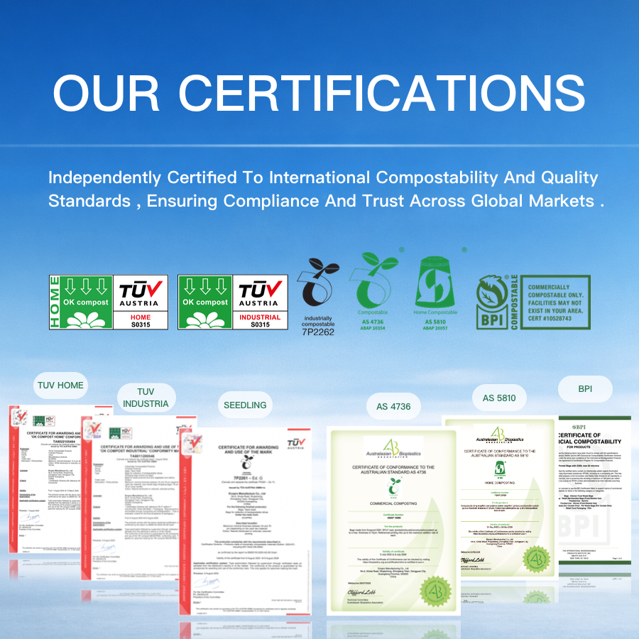 มาตรฐานการย่อยสลายได้:EN13432, OK Compost, BPI ASTM D6400 อีเอ็น13432, โอเค คอมโพสต์, บีพีไอ เอเอสทีเอ็ม ดี6400