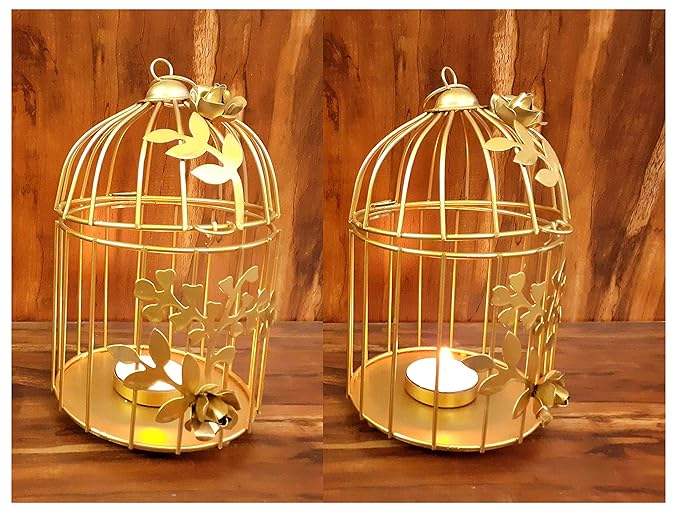 กรงนกโลหะแขวนตกแต่งผนังกรงสำหรับตกแต่งบ้านและห้องนั่งเล่นกรงนกที่ใส่แสงชาชุดสีทอง2ชิ้นผลิตในอินเดีย