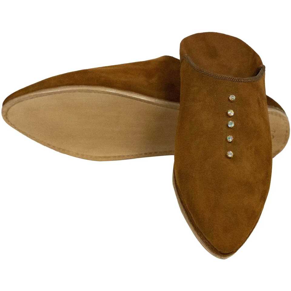 รองเท้าบูชสไตล์โมร็อกโกสำหรับผู้หญิง ยี่ห้อ Biyadina ทำจากหนังกลับสีน้ำตาล สำหรับใส่ในบ้าน พื้นรองเท้าด้านในทำจากยาง ซับในทำจากหนังแท้ ตกแต่งด้วยมุก