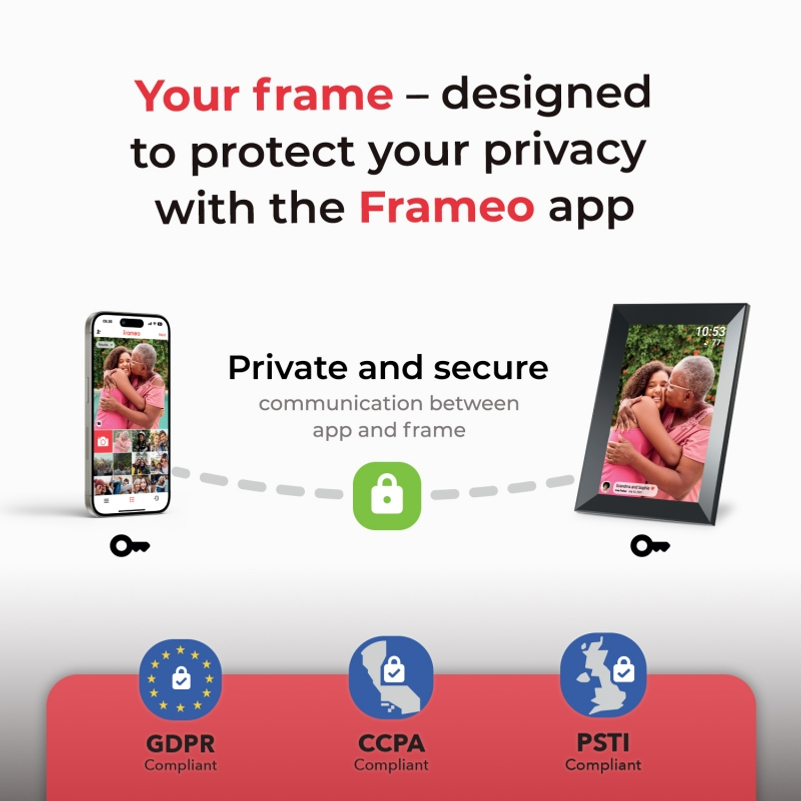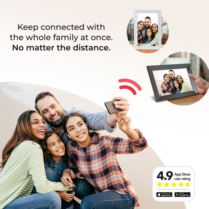 กรอบรูปดิจิตอลสีดำขนาด 10 นิ้ว โหลดจากหน่วยความจำโทรศัพท์ รองรับ Wifi ใช้แอป Frameo สำหรับแสดงภาพถ่าย วิดีโอแบบวนซ้ำ ติดผนังได้