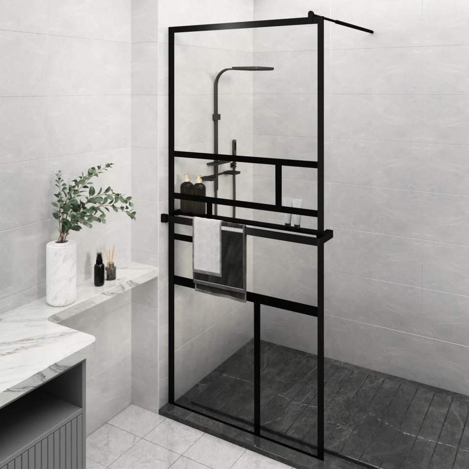 Black 35.4"x76.8" Walk-in Shower Wall with Shelf ESG Glass and Aluminum for Your Modern Bathroom