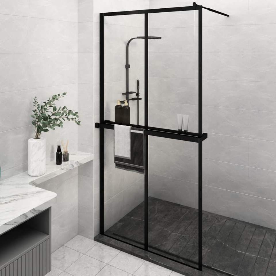 ผนังห้องอาบน้ำแบบวอล์กอินสีดำ ขนาด 46.5"x74.8" พร้อมชั้นวางของ ทำจากกระจก ESG และอะลูมิเนียม ประตูห้องอาบน้ำที่สวยงามและทนทาน