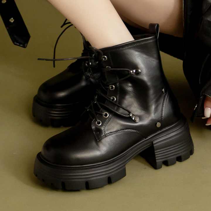 รองเท้าบูทคอมแบทสีดำ พื้นหนา 6.5 ซม. ทรงกว้าง คอลเลคชั่นฤดูหนาว
