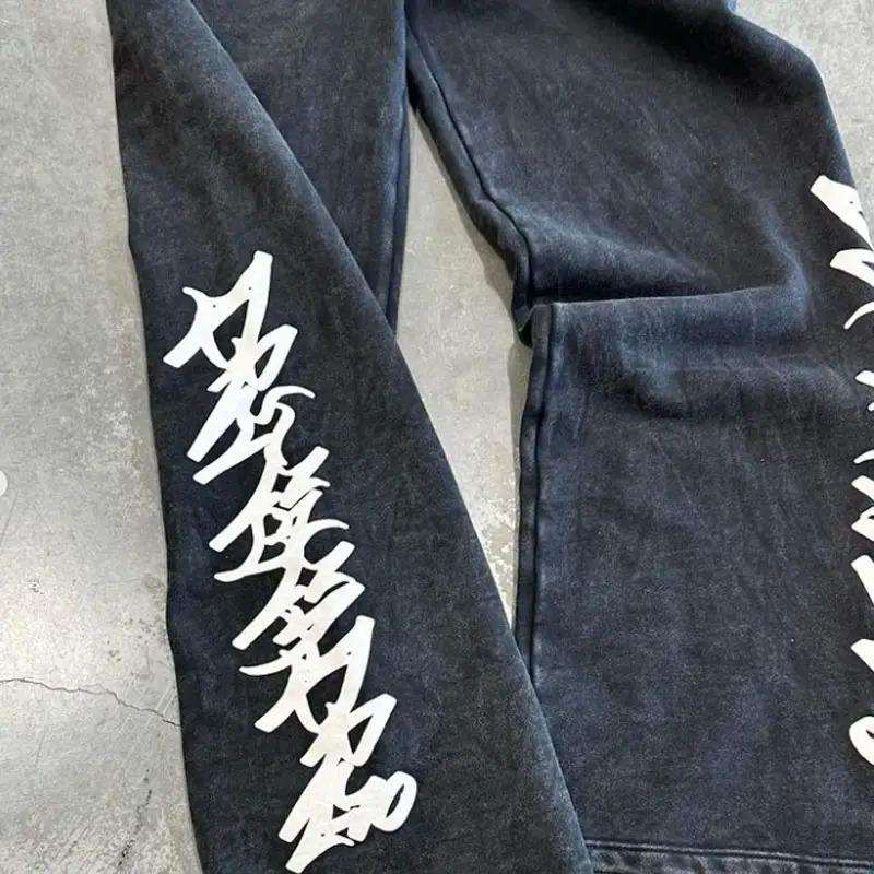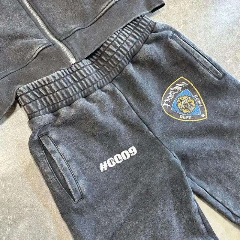 ชุดเซ็ตสตรีทแวร์วินเทจสีดำฟอกกรดแบบซิปเต็มตัว พร้อมกางเกงวอร์มขาบานและเสื้อฮู้ดดี้สำหรับผู้ชาย