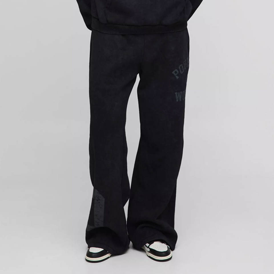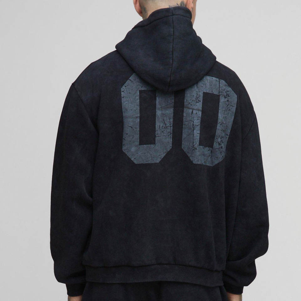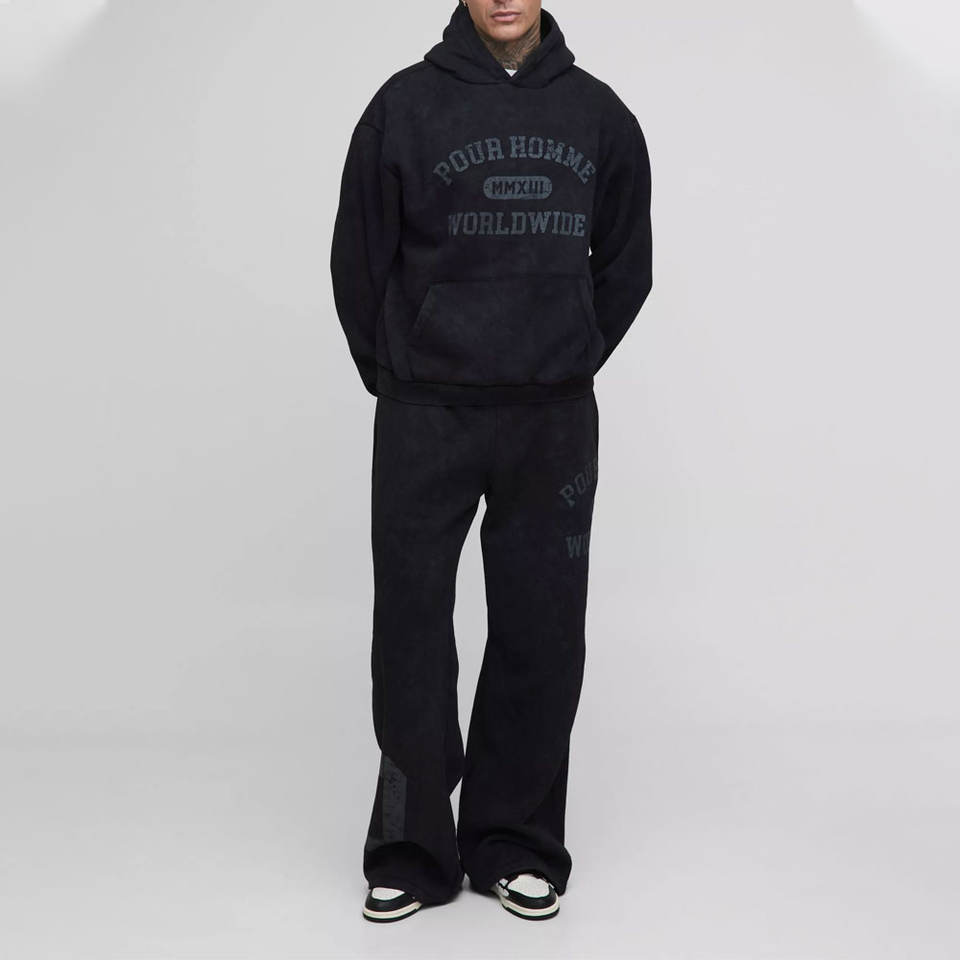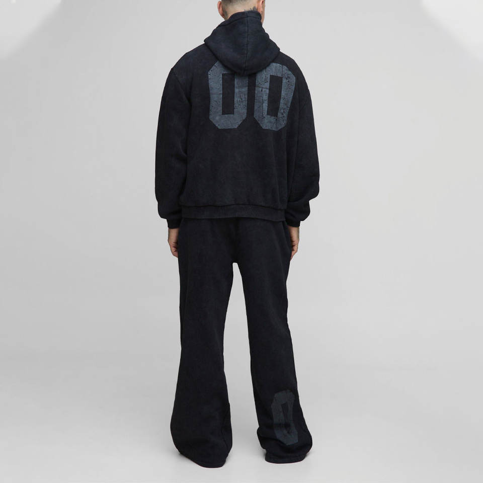 ชุดเซ็ตสตรีทแวร์วินเทจสีดำฟอกกรดแบบซิปเต็มตัว พร้อมกางเกงวอร์มขาบานและเสื้อฮู้ดดี้สำหรับผู้ชาย