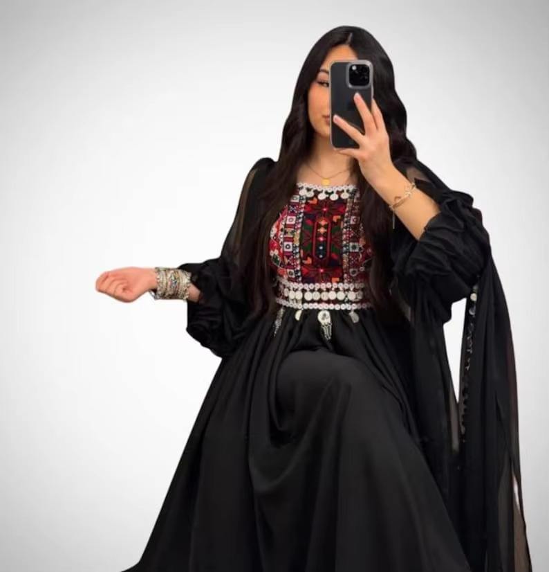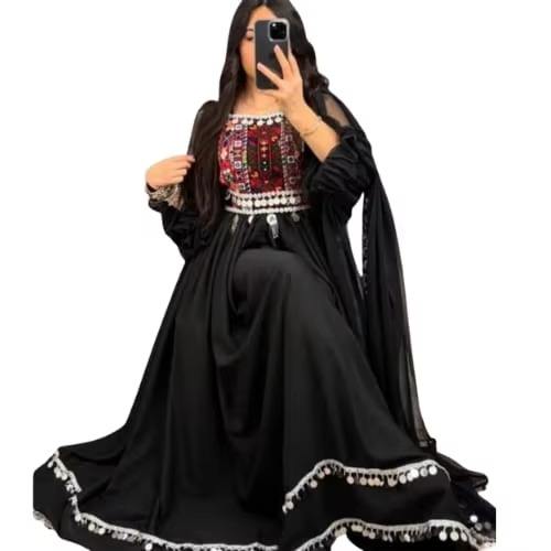 ชุดราตรีสีดำสไตล์อัฟกันแบบมินิมอล คูชี แขนเสื้อโปร่ง ประดับเหรียญ ทรงปอชัก ตกแต่งด้วยเหรียญ ทรงโมเดิร์นแบบอัฟกัน