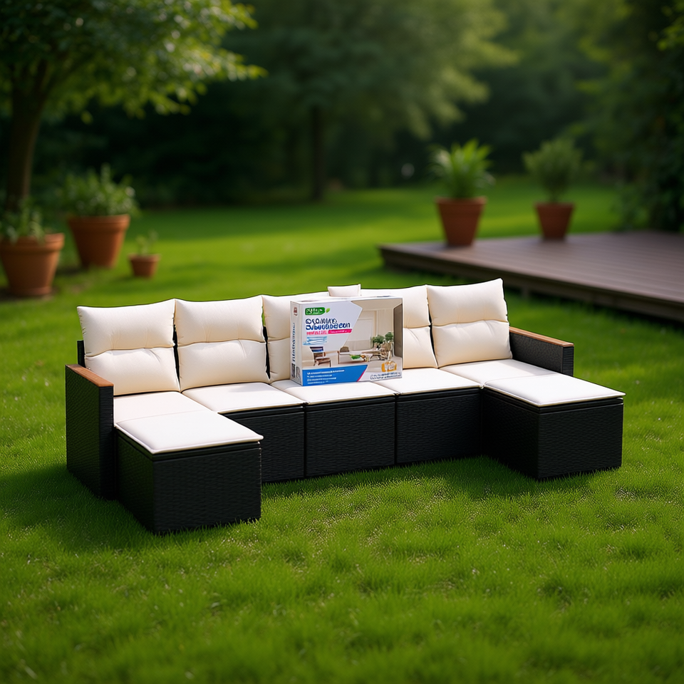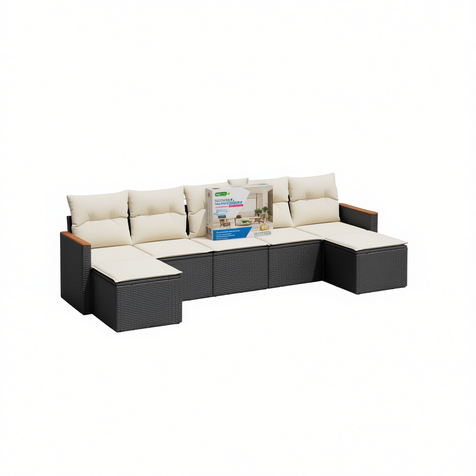 ชุดโซฟาสวนสีดำและครีม เฟอร์นิเจอร์หวายกลางแจ้ง พร้อมเบาะโฟมความหนาแน่นสูง กันน้ำ ดีไซน์ร่วมสมัย