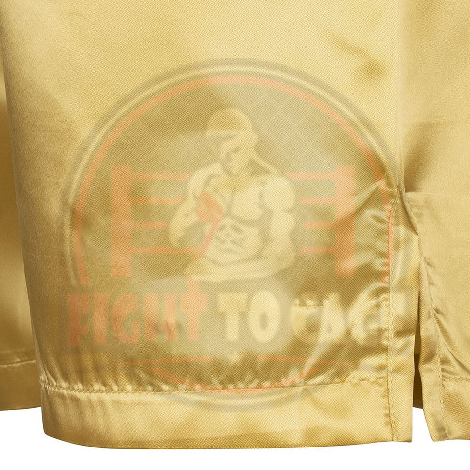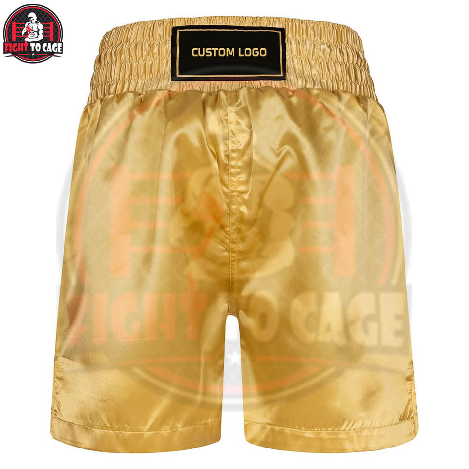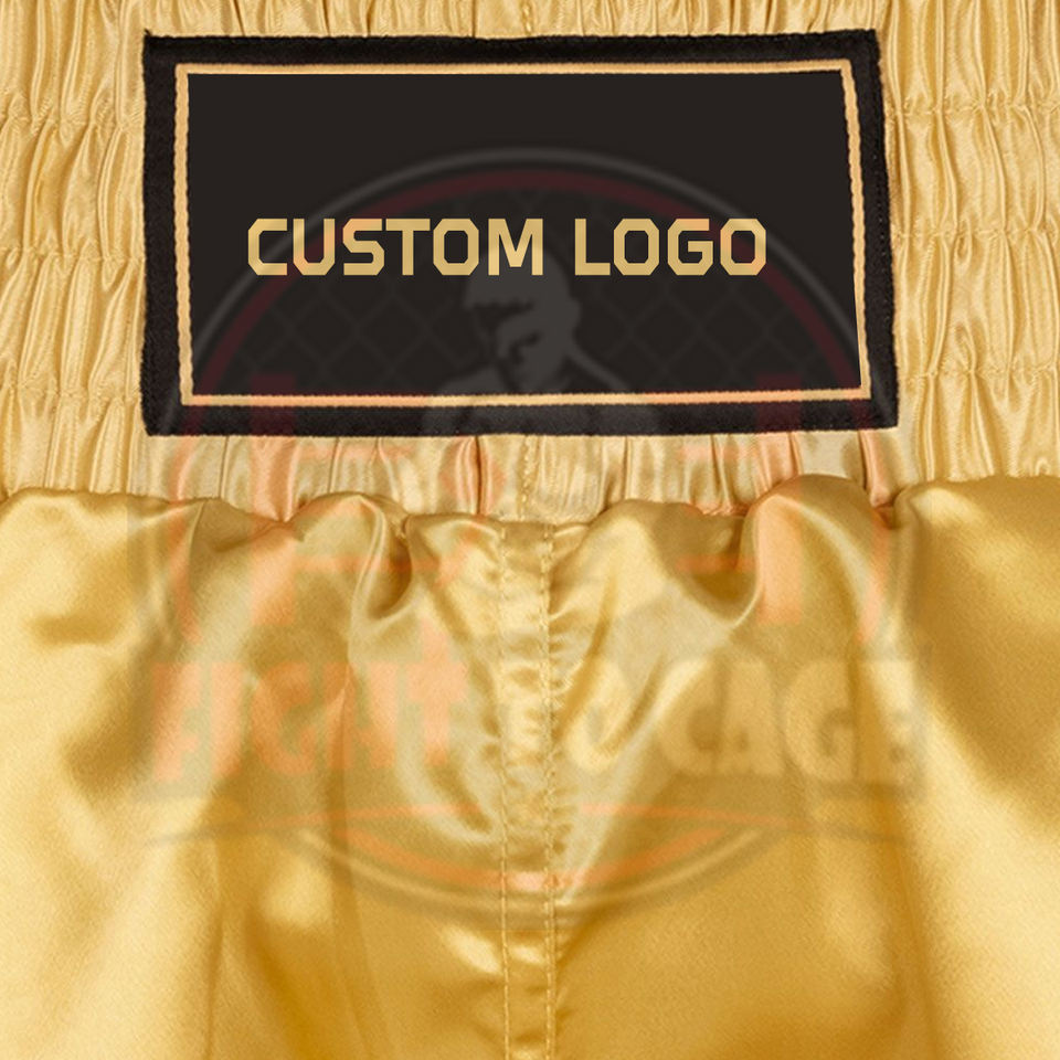 กางเกงชกมวยสีดำทองตัดกัน พร้อมโลโก้สั่งทำ OEM/ODM คุณภาพสูงสุด ผลิตจากโพลีเอสเตอร์ระบายอากาศได้ดี เหมาะสำหรับการฝึกซ้อมในฤดูใบไม้ร่วง