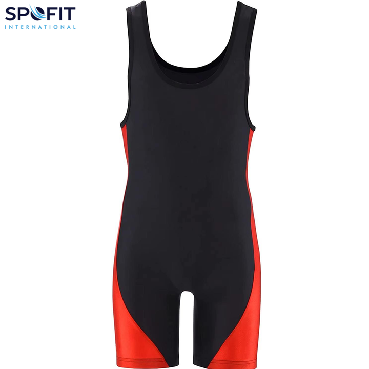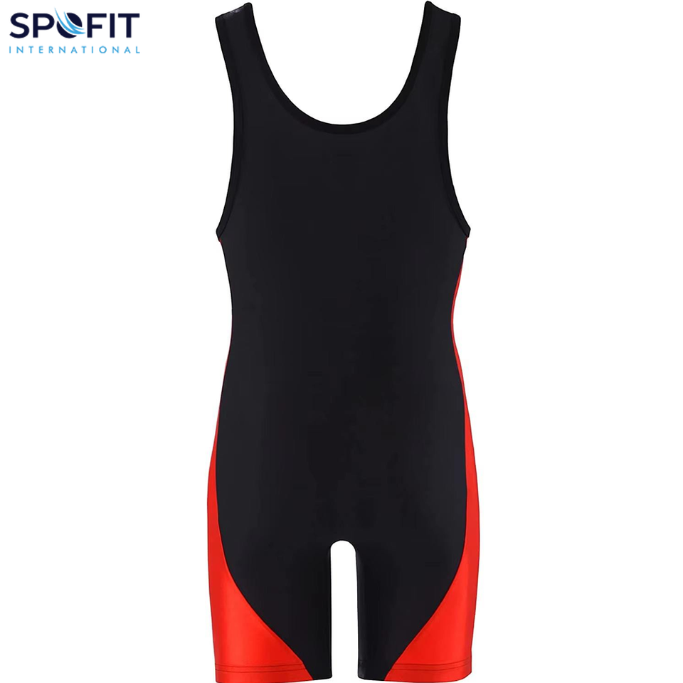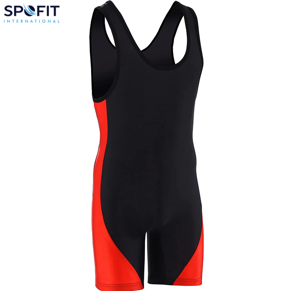 ชุดซิงเกิลเล็ตสำหรับนักมวยปล้ำชาย สีดำและสีแดงตัดกัน คุณภาพสูง ขายดี บริการ OEM ระบายอากาศได้ดี โดย SPOFIT