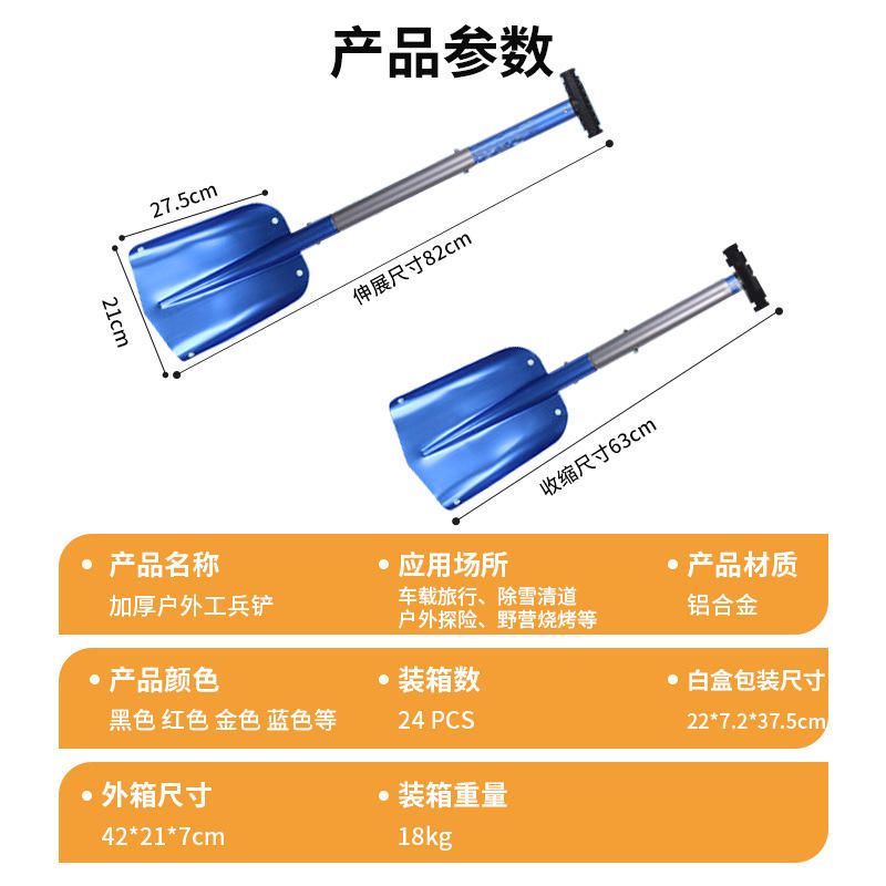 พลั่วหิมะอะลูมิเนียมเคลือบสีดำแบบยืดหดได้ 63-82 ซม. ด้ามจับรูปตัว D อเนกประสงค์ สำหรับกิจกรรมกลางแจ้งและปีนเขา