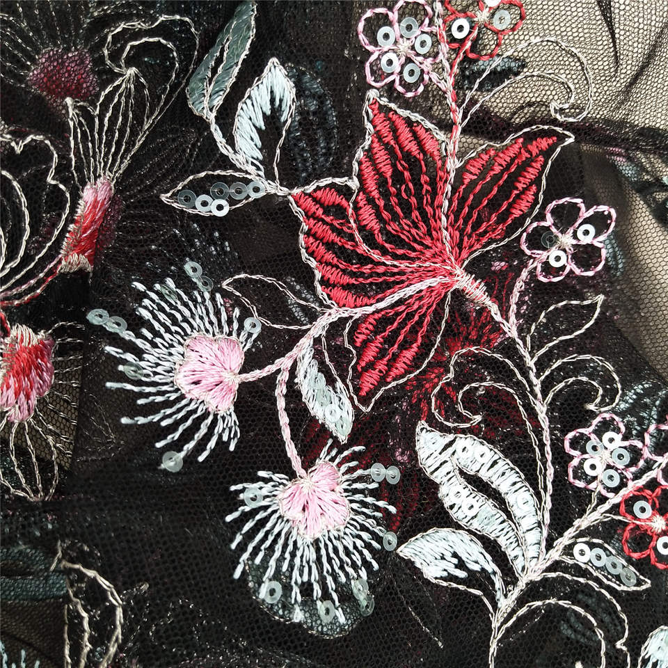 ผ้าตาข่ายสีดำผ้าลูกไม้ปักลายดอกไม้หรูหราสไตล์ฝรั่งเศสใหม่สำหรับชุดทำงานชุดแต่งงานเซ็กซี่