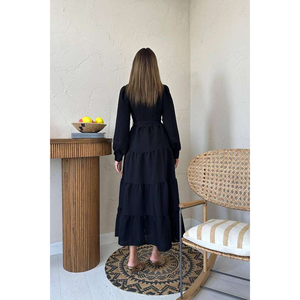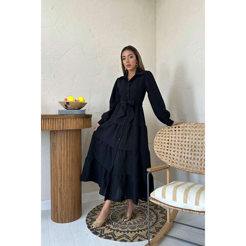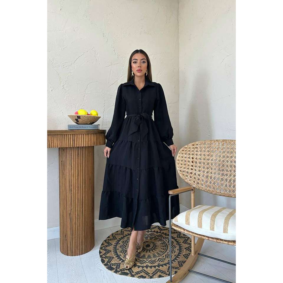 เดรสทรงเอไลน์สีดำ คอทรงโอ ผ้าทอ ใส่ได้ทุกวัน สไตล์ลำลอง เอวธรรมชาติ ซักได้