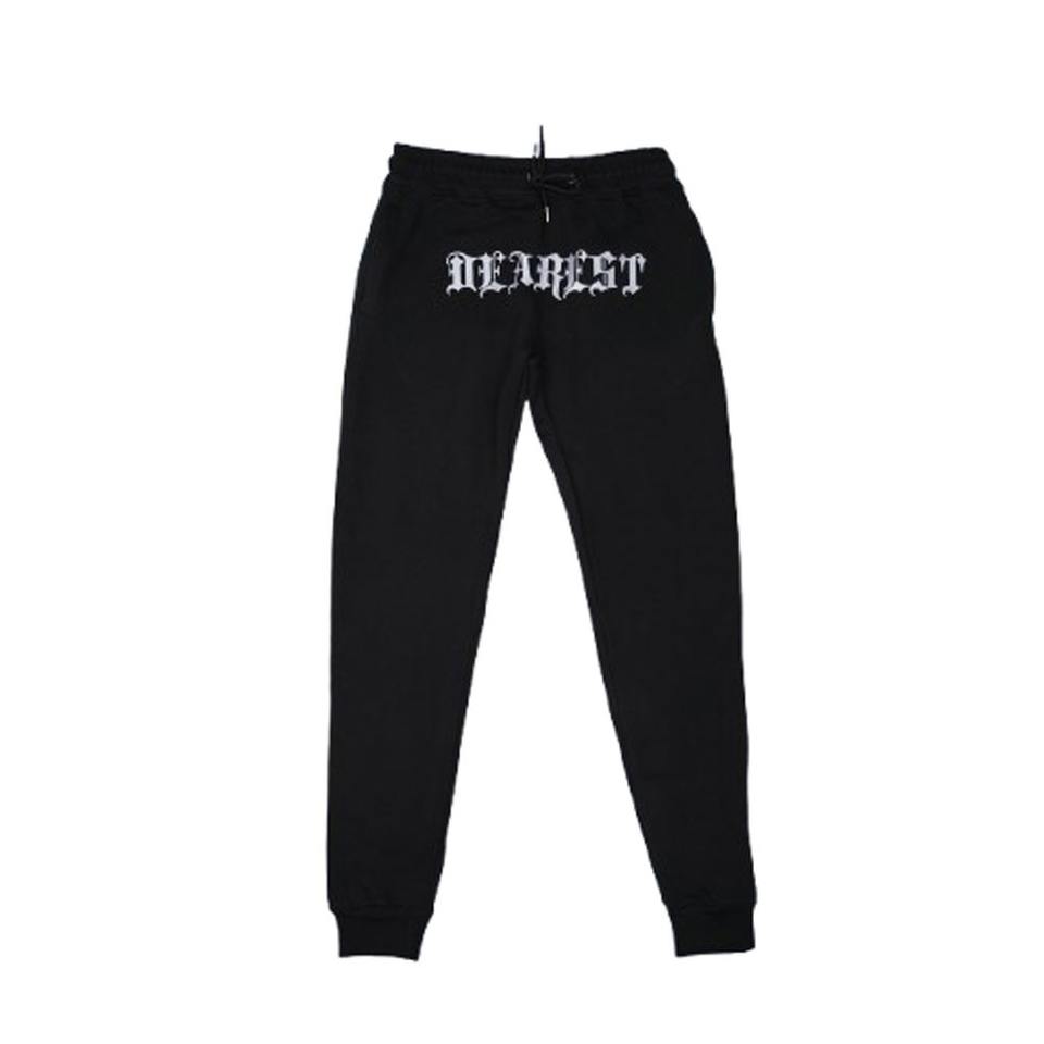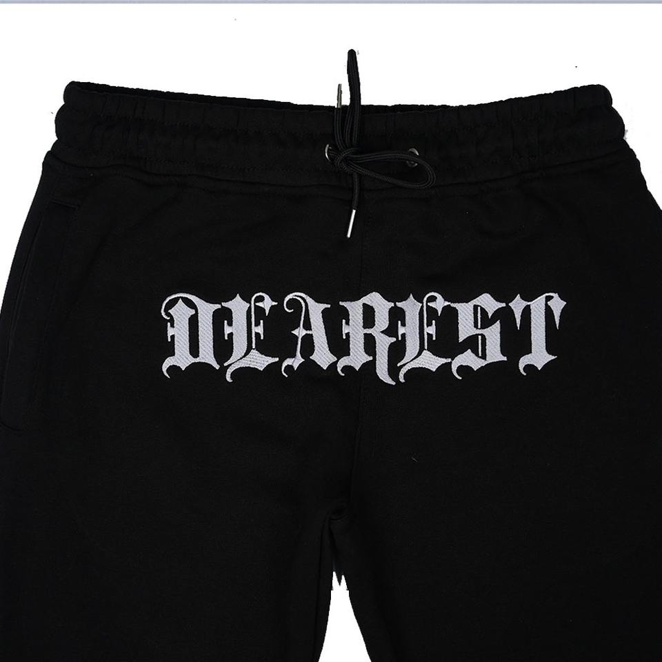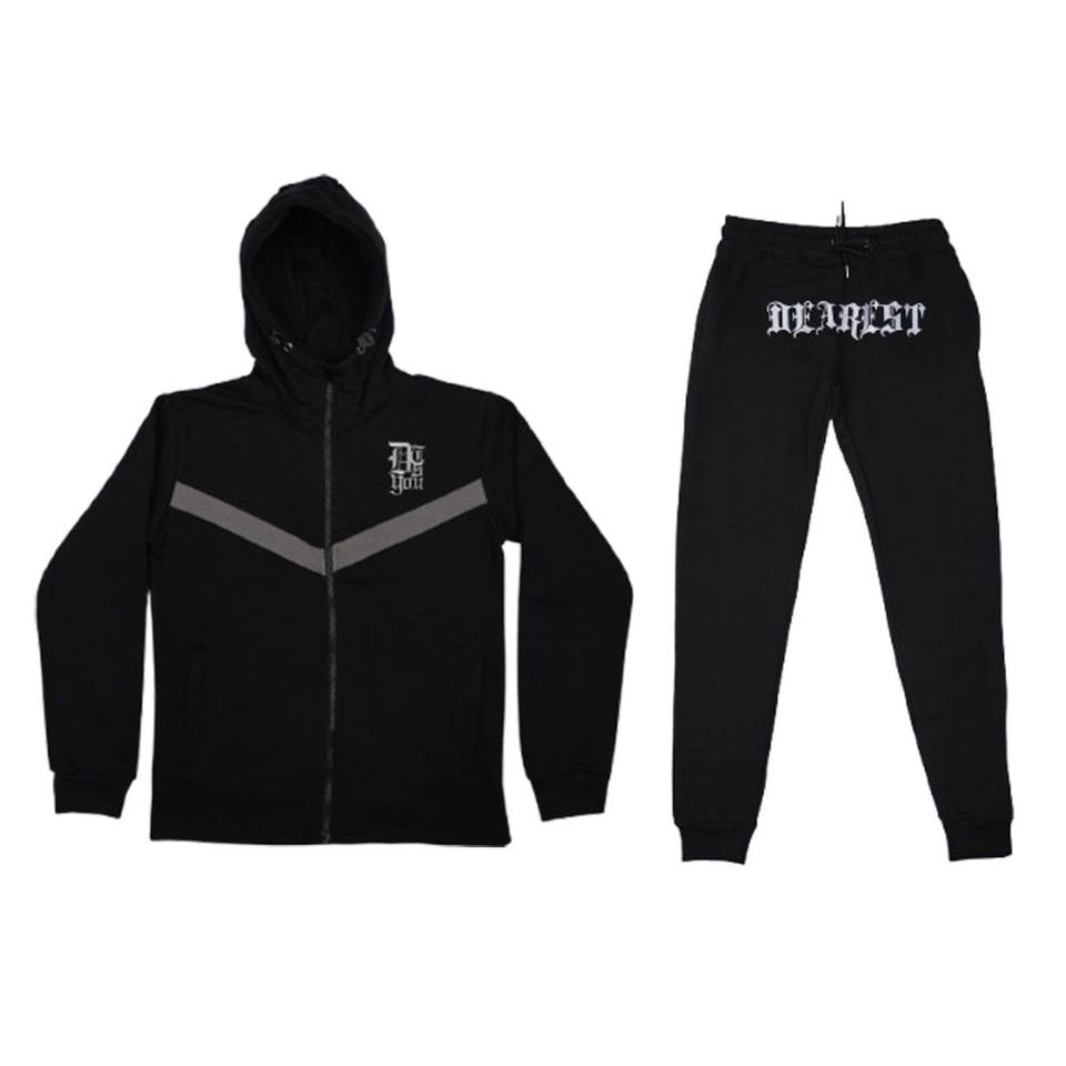 ชุดวอร์มผ้าฟลีซสองชิ้นพร้อมโลโก้ปักและพลอยเทียมสำหรับผู้ชายชุดออกกำลังกายกางเกงออกกำลังกายในยิมสีดำและน้ำเงิน