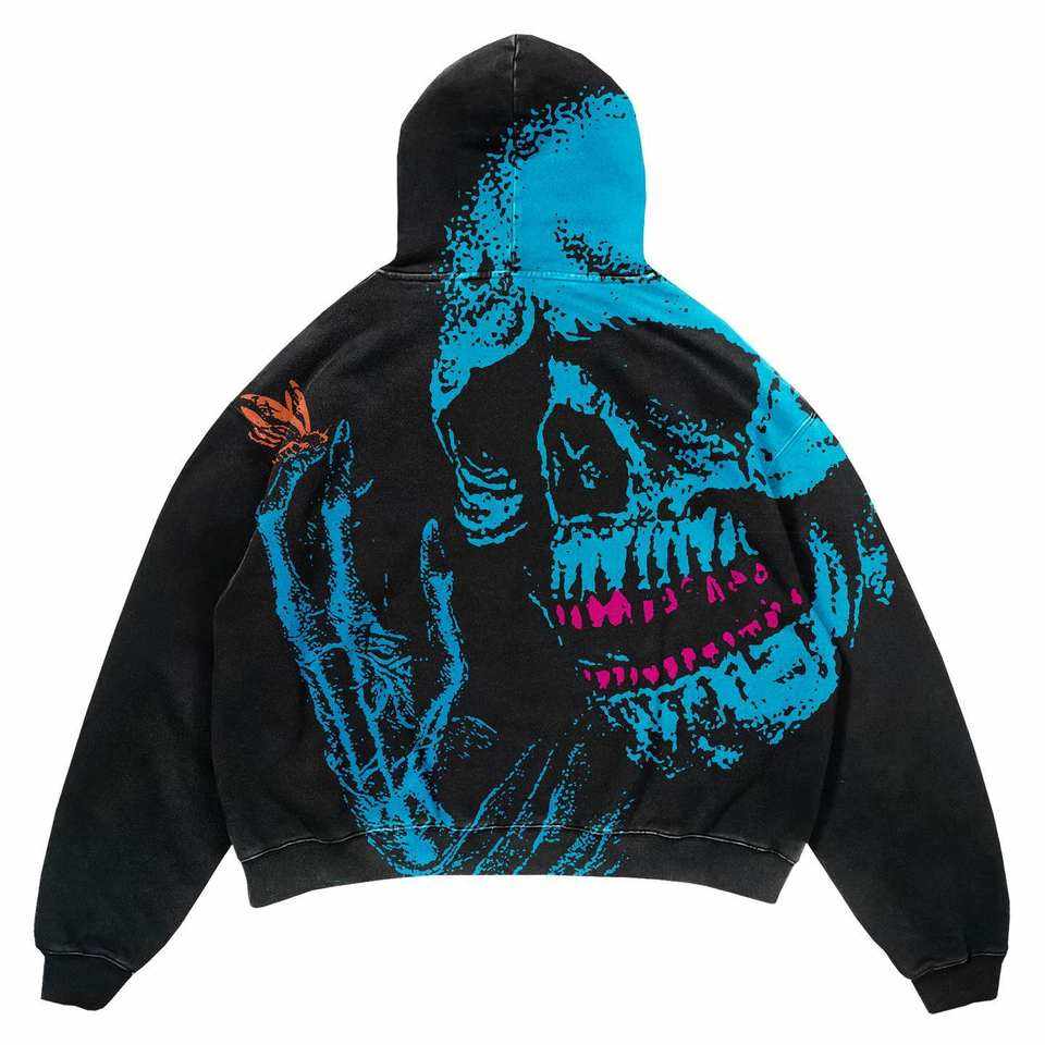 เสื้อฮู้ดกะโหลกสีดำสีน้ำเงินสำหรับผู้ชายและผู้หญิงเสื้อผ้าแนวสตรีทเสื้อสวมหัวแขนยาวผ้าฟลีซให้ความอบอุ่นเสื้อแฟชั่นลายกราฟิก