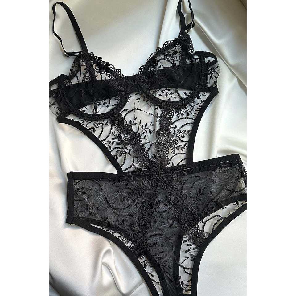 ชุดบอดี้สูทสีดำประดับลูกไม้ ชุดชั้นในแบบหรูหราพร้อมกางเกงใน
