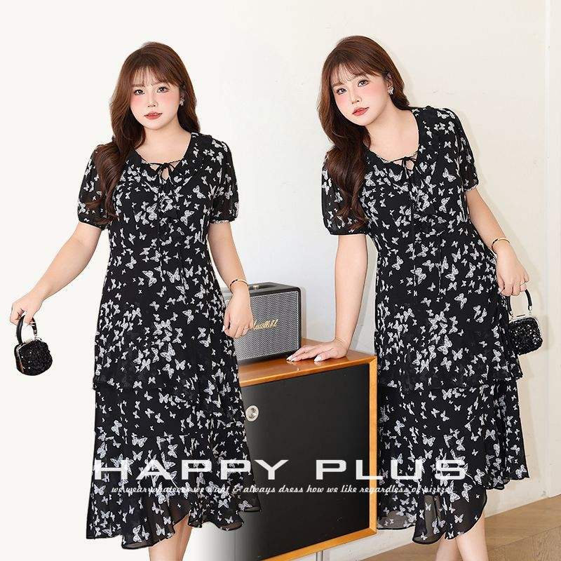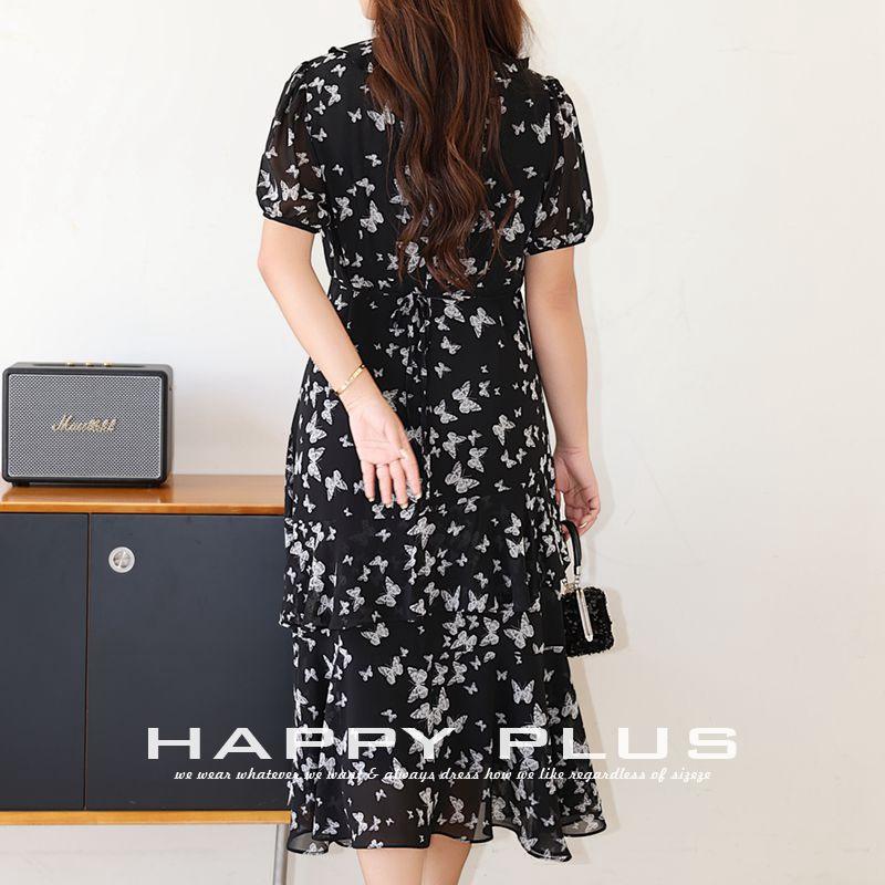 ชุดเดรสคอวีพิมพ์ลายผีเสื้อสีดำพร้อมระบายเอวเข้ารูปลำลองสวมใส่ได้ทุกวันสำหรับผู้หญิง