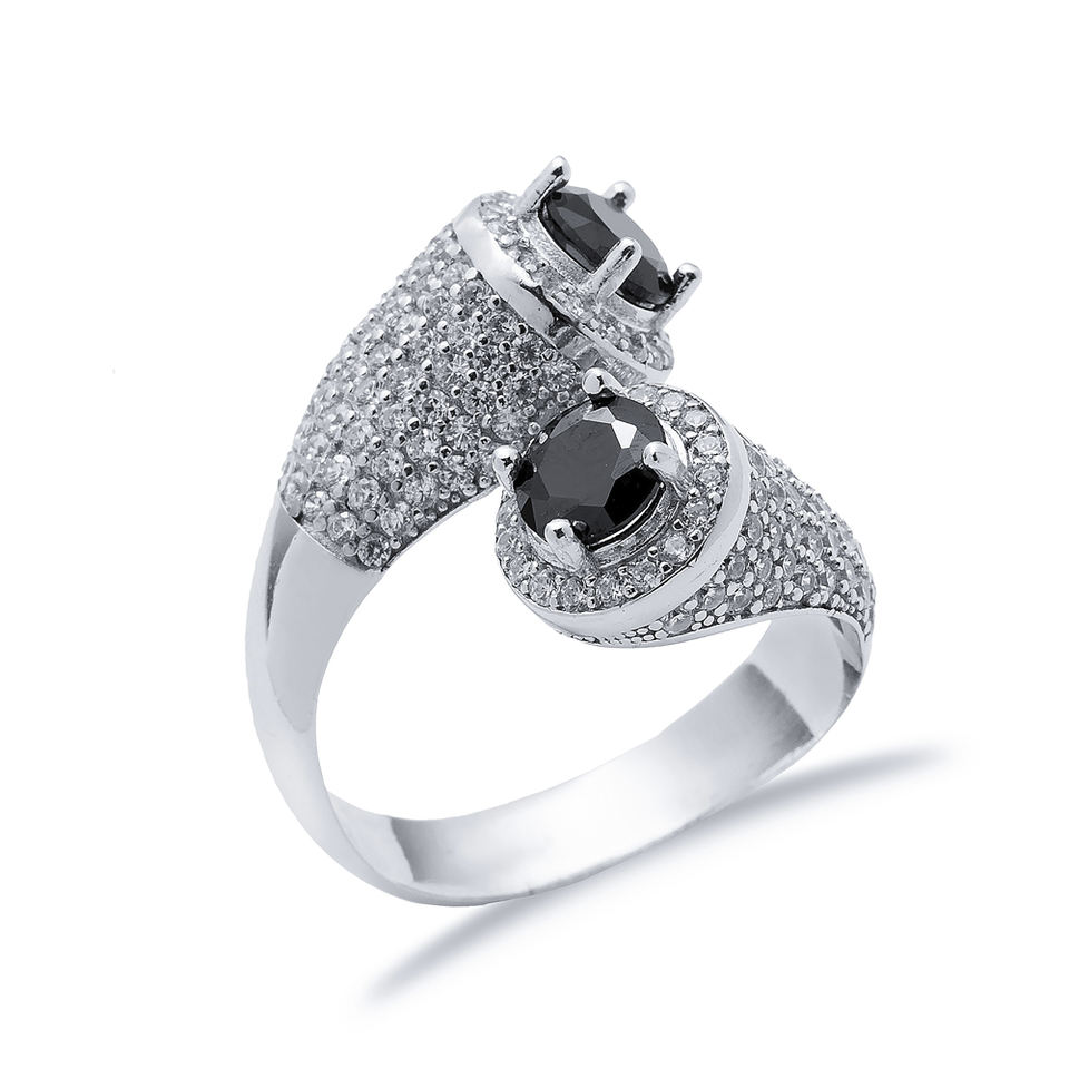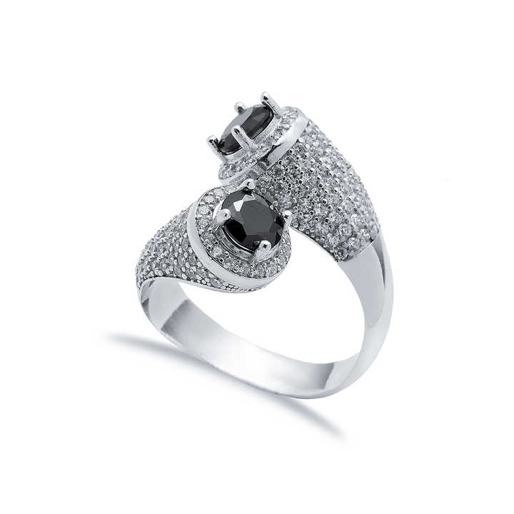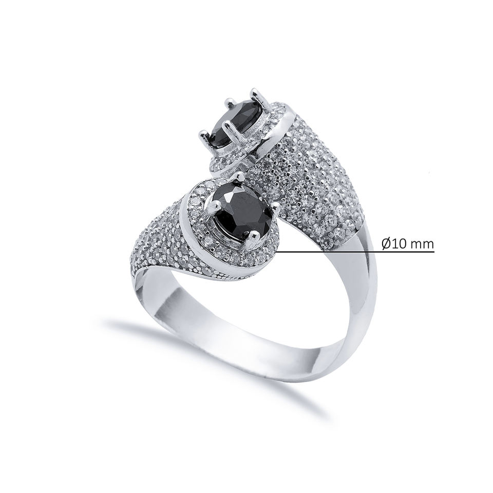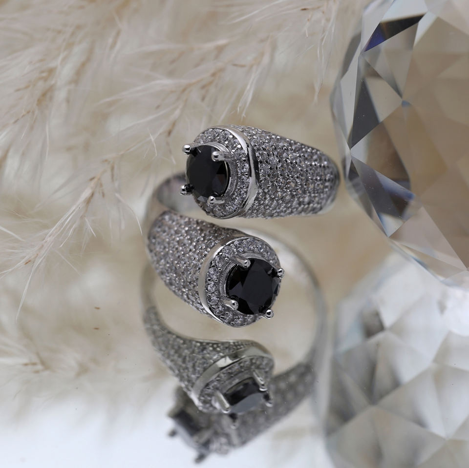 หิน CZ สีดําสองด้านกลมหินคลัสเตอร์แหวนเงินปรับได้ขายส่งแฮนด์เมดเงินแท้ 925