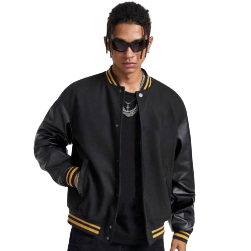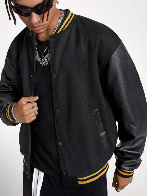 เสื้อแจ็กเก็ตสีดำสำหรับ100% ในฤดูหนาวสำหรับผู้ชายผ้าคอตตอนแขนเสื้อลายทางผ้าเบสบอลของวิทยาลัยสีดำสำหรับผู้ชายใส่โลโก้ได้ตามที่ต้องการ