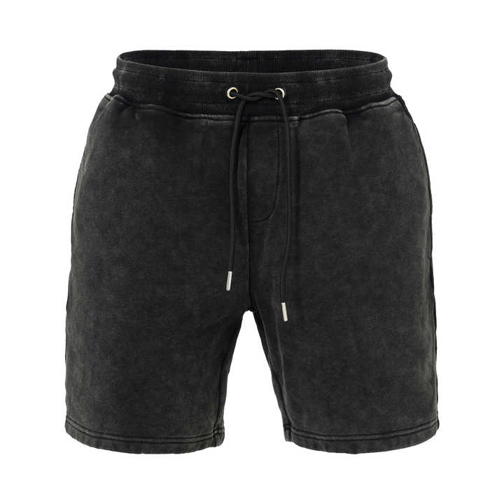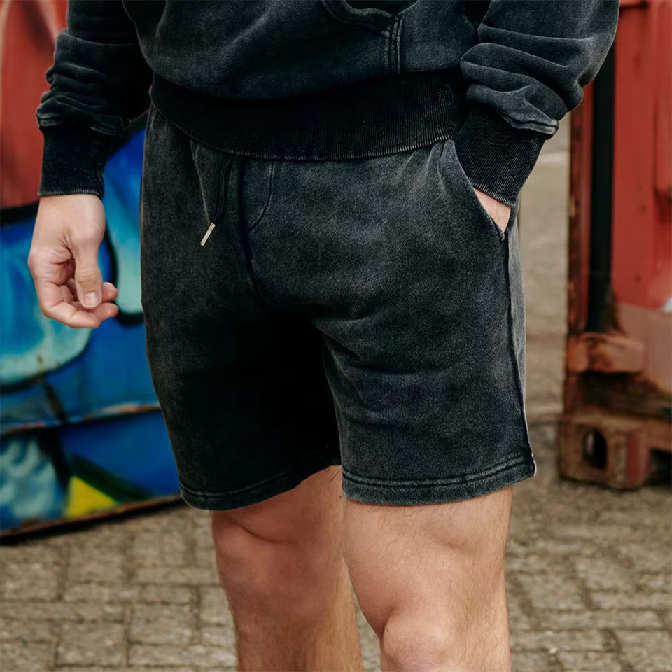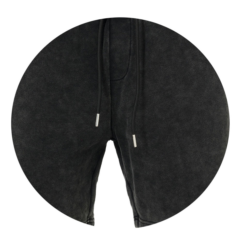 กางเกงขาสั้นสีดำฟอกสีสไตล์วินเทจสำหรับผู้ชาย ผ้าฝ้าย มีเชือกผูกเอว พร้อมออกแบบลายตามสั่ง รับผลิตแบบ OEM ราคาขายส่ง