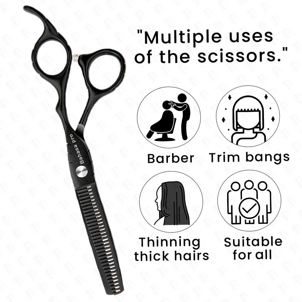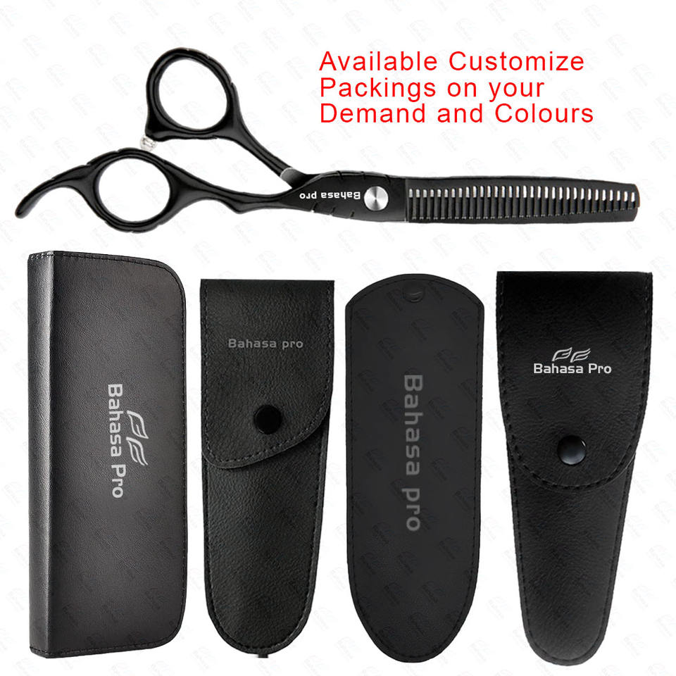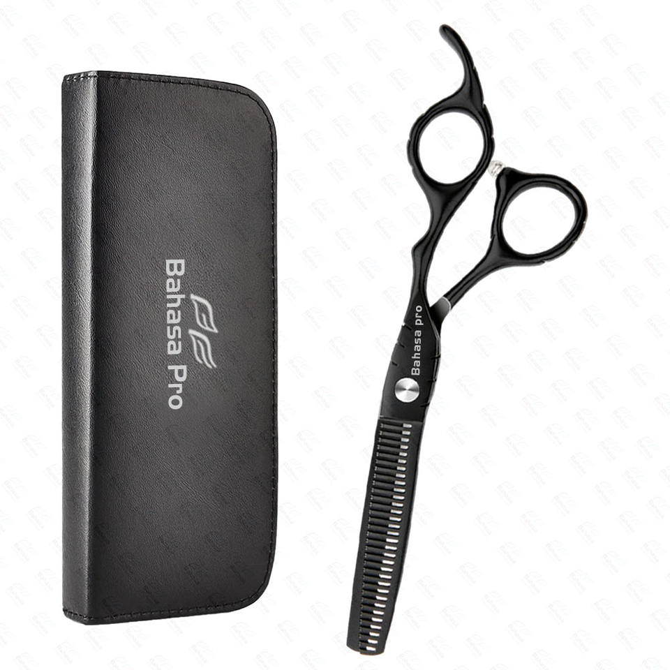 กรรไกรตัดผมบางสีดำกรรไกรตัดผมสแตนเลสพร้อมที่วางนิ้ว